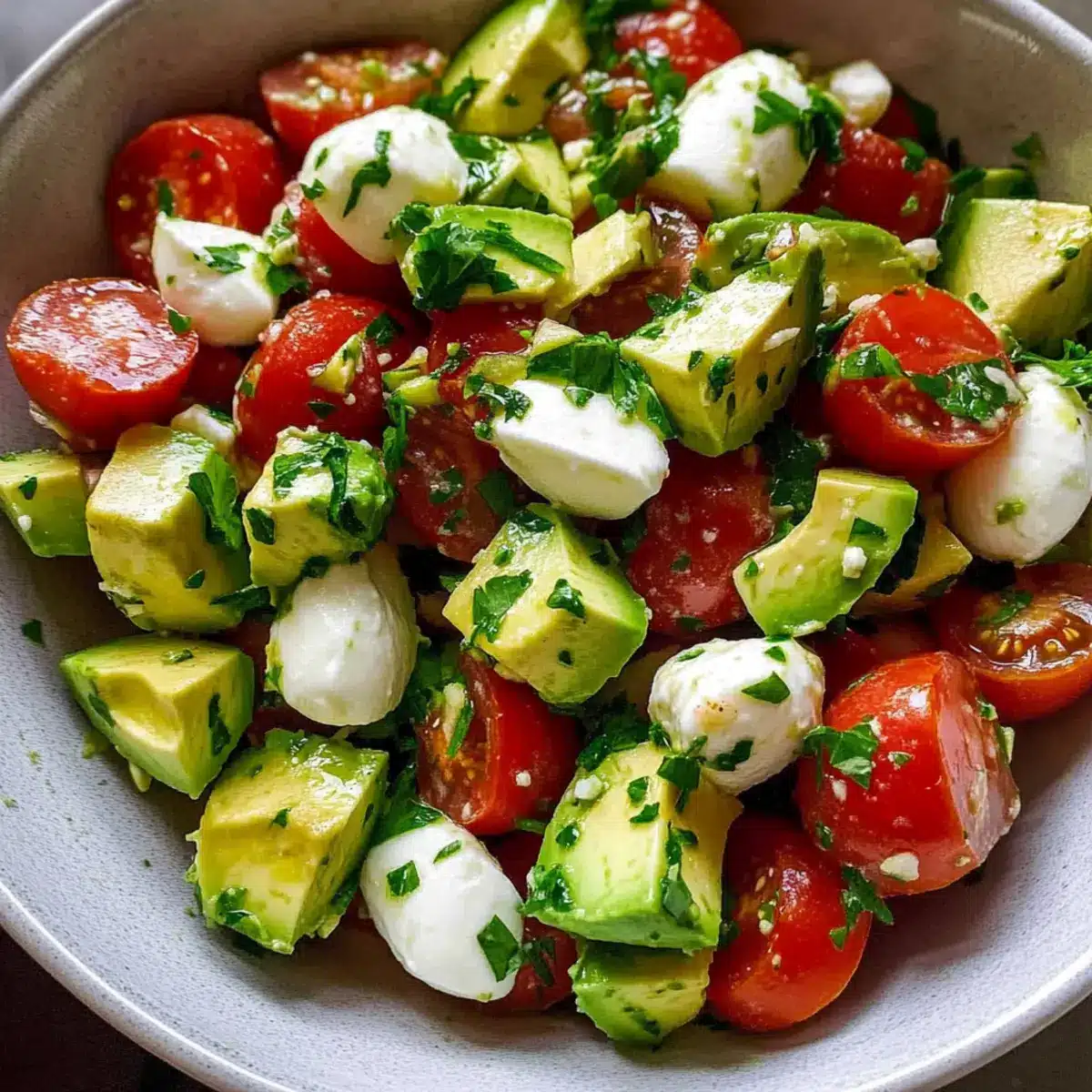Experiment with Herbs: Feel free to swap parsley with fresh basil or cilantro to infuse different flavors into your avocado salad with fresh tomatoes and mozzarella.