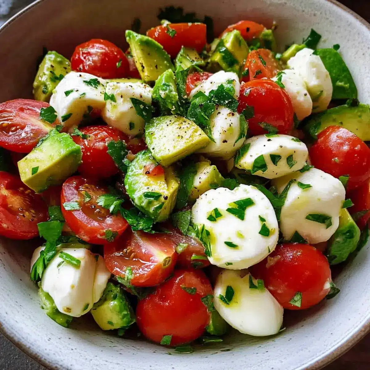 Finally, chop a handful of fresh parsley and sprinkle it over the salad for added color and flavor. Season your dish with freshly cracked black pepper according to your taste preferences. Toss the salad lightly one more time to integrate the parsley, ensuring each element shines in your final avocado salad with fresh tomatoes and mozzarella.