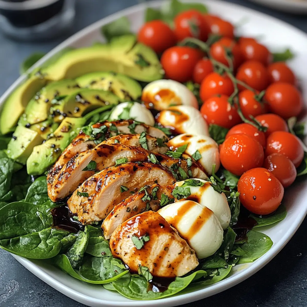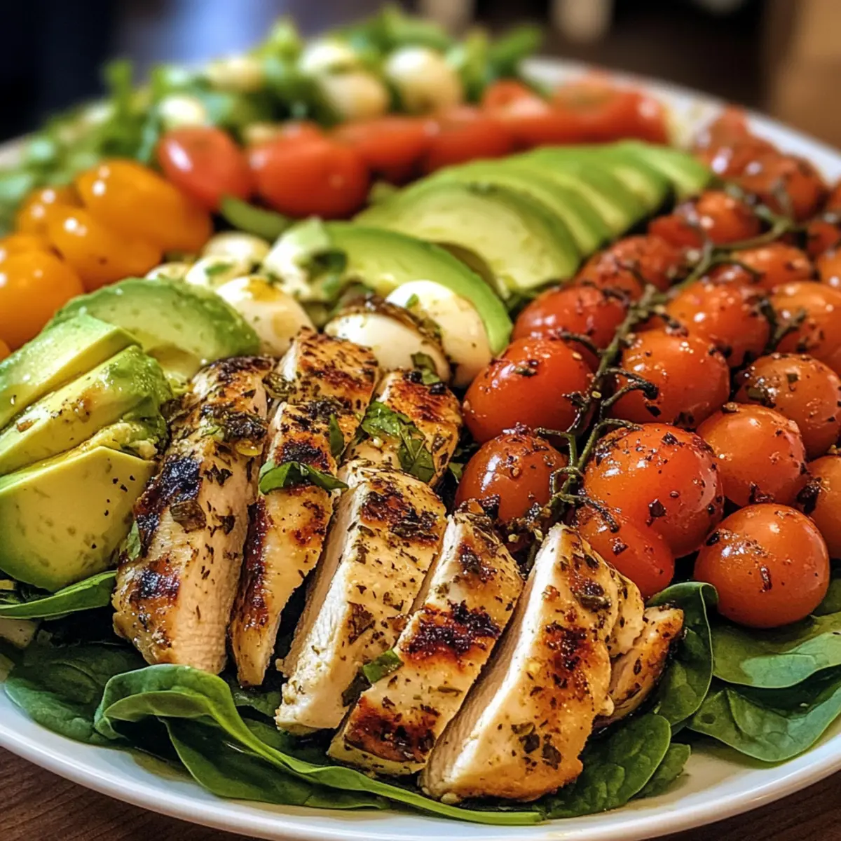 - In a large bowl, lay down a bed of baby spinach. Top with the sliced baked chicken, mozzarella balls, avocado slices, and halved cherry tomatoes.