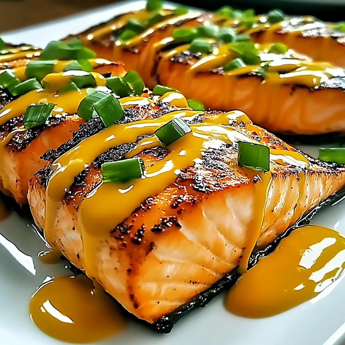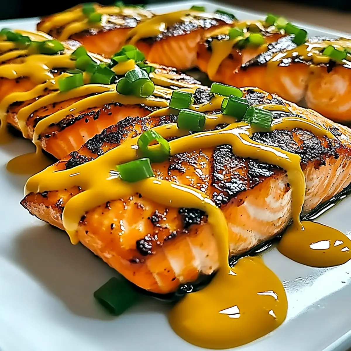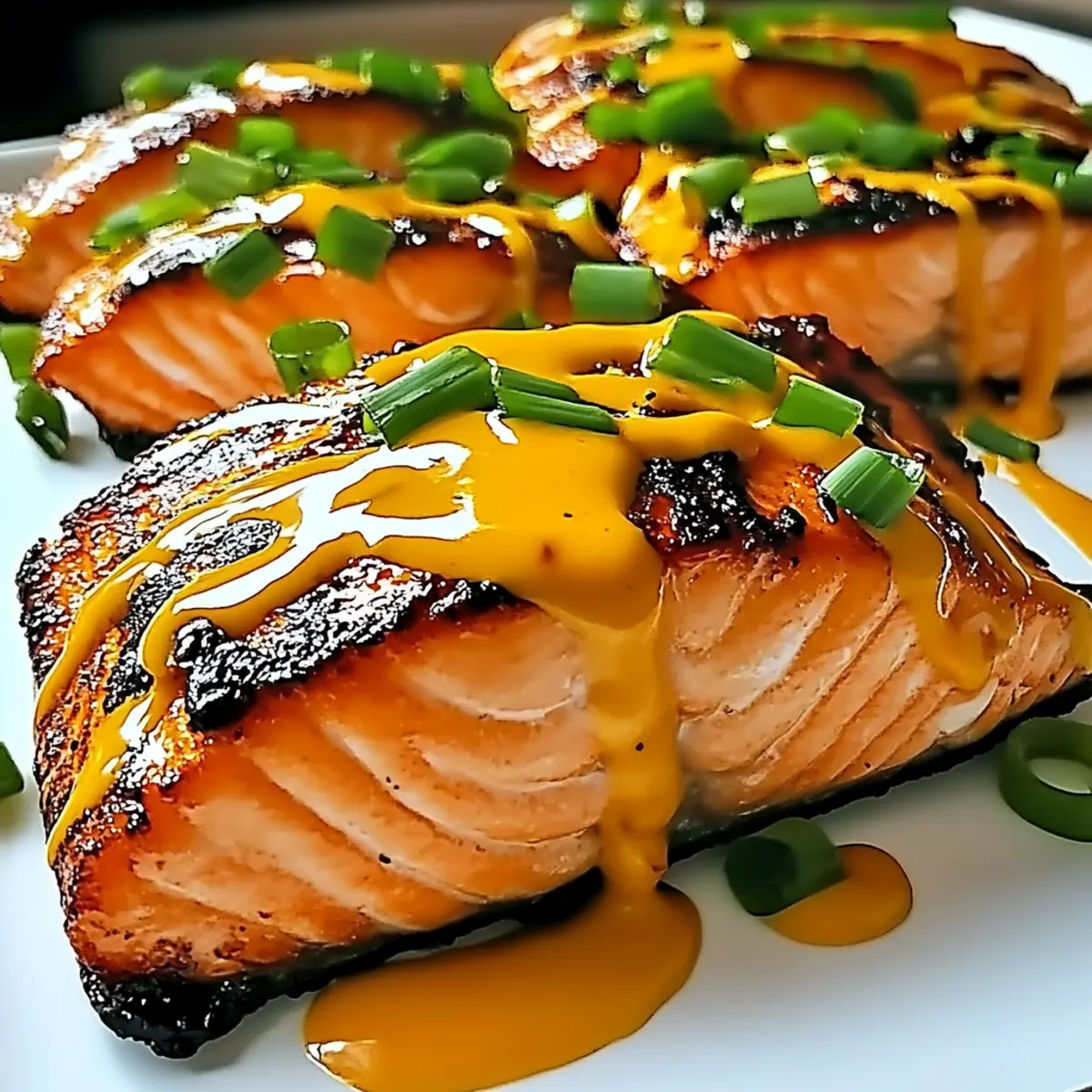 - Transfer cooked salmon to a serving plate, drizzle with Bang Bang sauce, and garnish with sliced green onions.