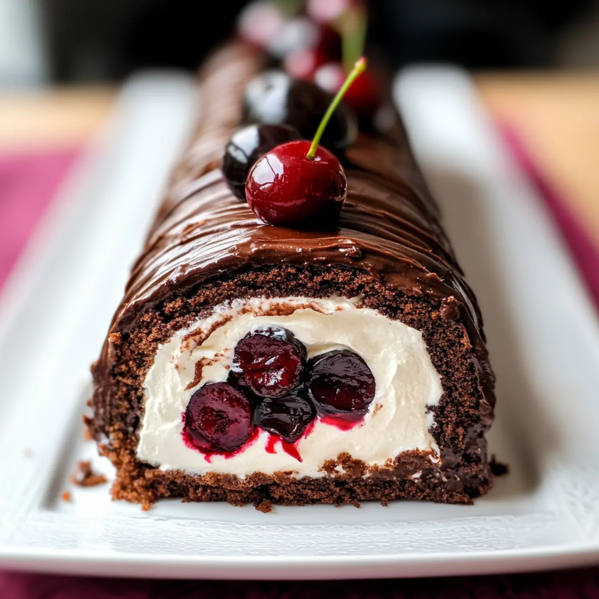 Finally, pour the chocolate ganache over your Black Forest Swiss Roll, covering it completely for a decadent finish. For an extra touch, whip additional cream and pipe it decoratively on top. Finish with fresh cherries for a delightful presentation, making this dessert simply irresistible!
