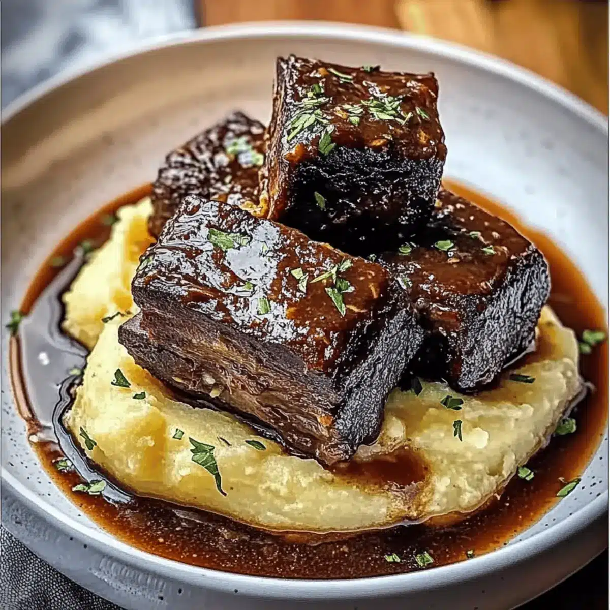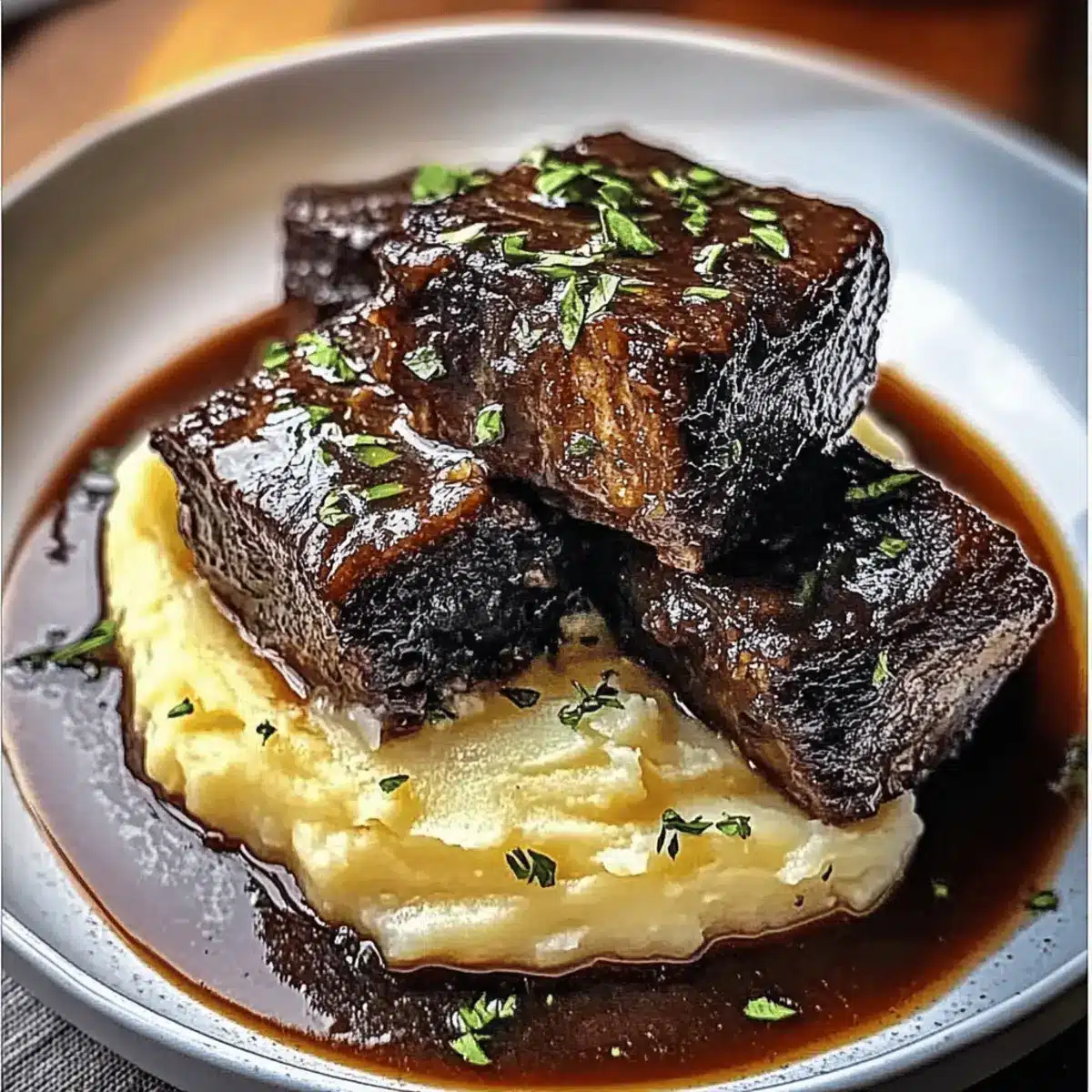To plate, spoon a generous serving of creamy garlic mashed potatoes onto each dish. Top with the tender braised short ribs, ensuring to drizzle the rich braising sauce over the top. Garnish with fresh herbs for an inviting look, and prepare to impress everyone at the table with this heartwarming meal!