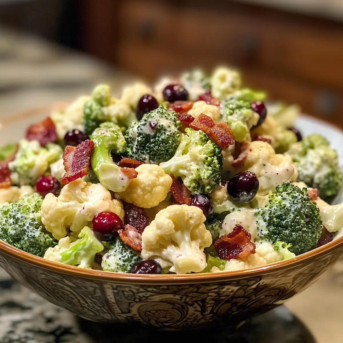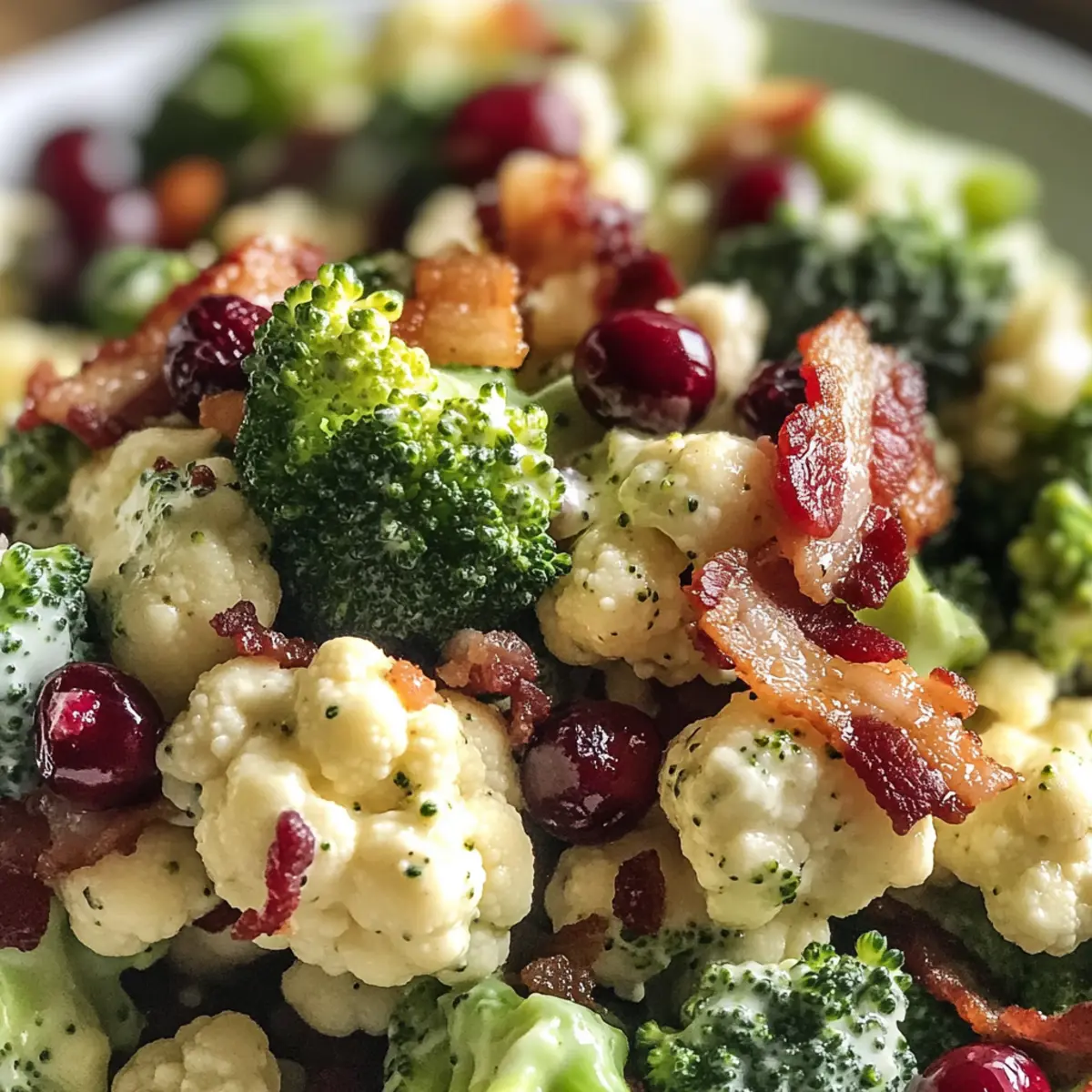 Broccoli Cauliflower Salad with Crispy Bacon and Sweet Cranberries
