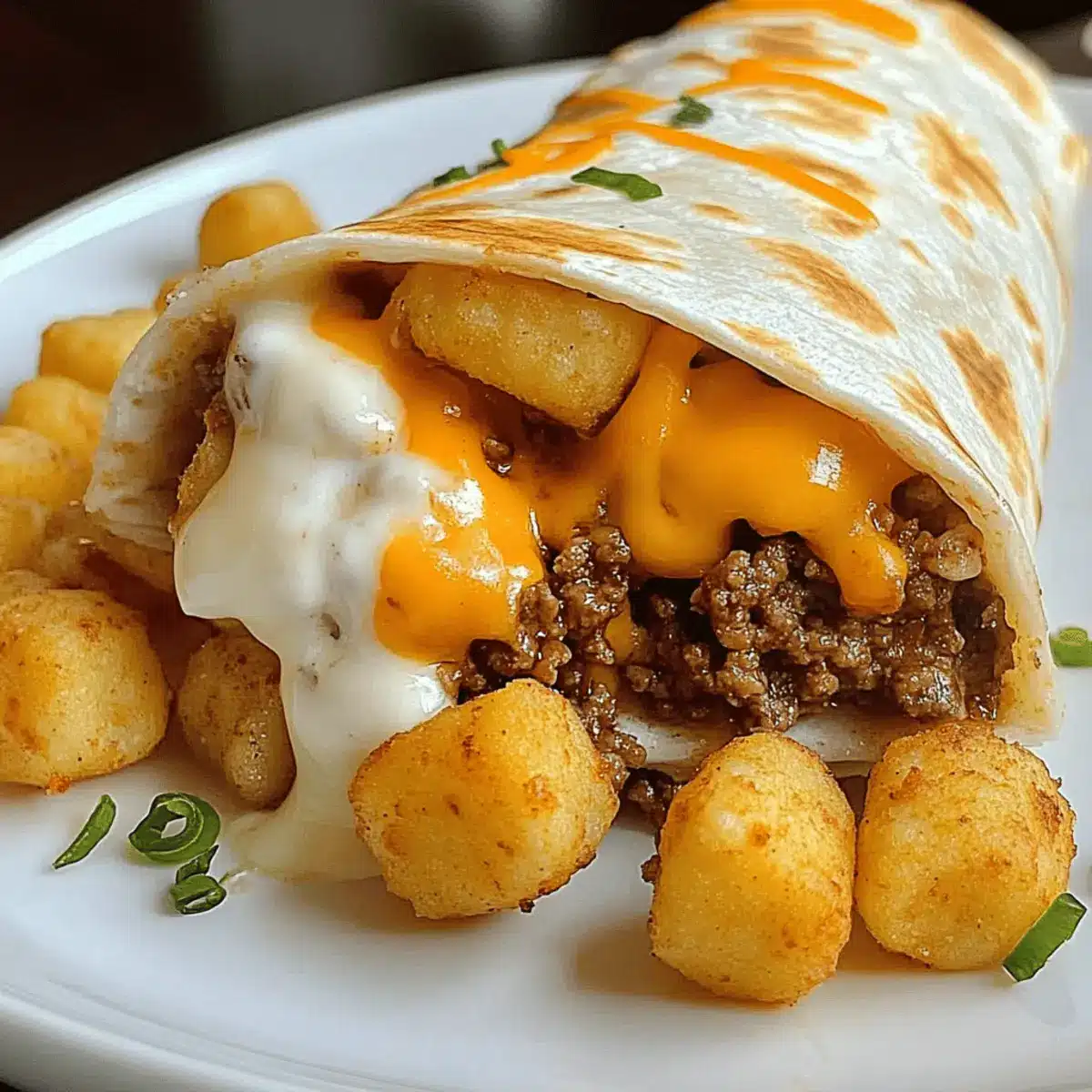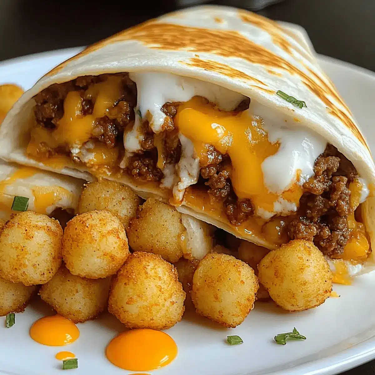 Preheat your oven to 425°F (220°C). Spread the frozen tater tots on a baking sheet in a single layer and bake according to package instructions, typically around 20–25 minutes, or until they are golden brown and crispy. Keep an eye on them as they bake for a satisfying crunch that will elevate your Cheesy Potato Burritos Delight.