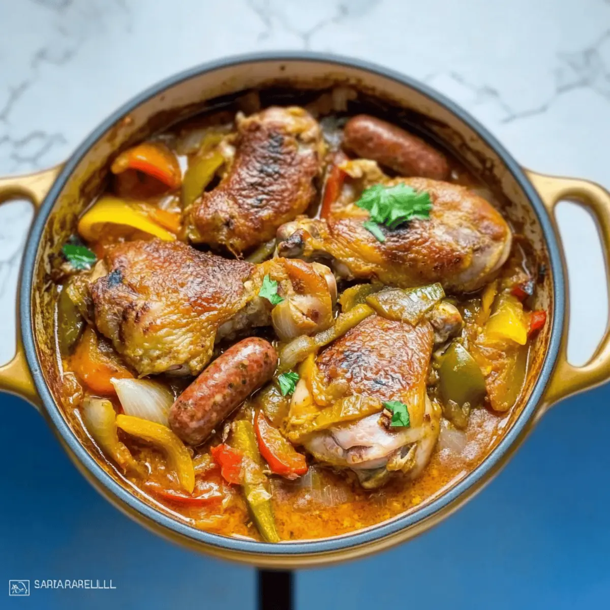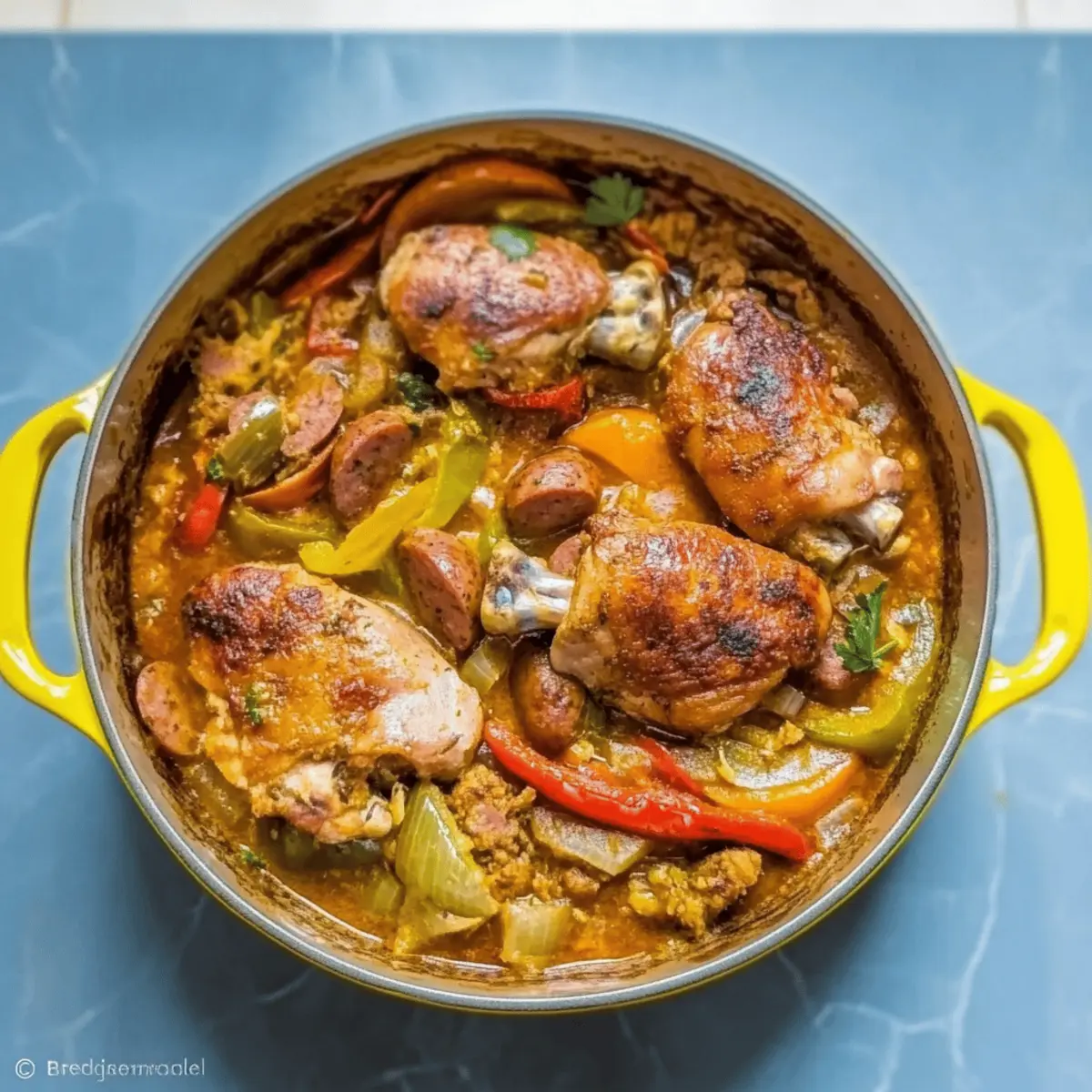 - Return the browned chicken thighs and sausages to the pan with the vegetables. Pour in ¼ cup of red wine vinegar, followed by ½ cup of white wine and 1 cup of chicken stock. Stir gently to combine, bringing the mixture to a simmer. Carefully cover the pot and transfer it to a preheated oven set to 375°F, allowing it to braise for about 30 minutes.