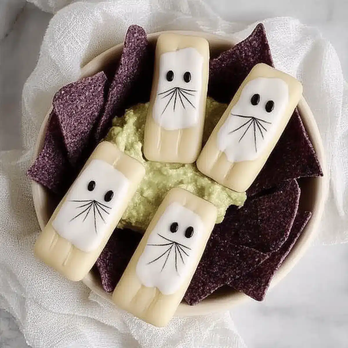 Mummy Hot Dogs: Wrap mini hot dogs in crescent roll strips and bake until golden. These savory bites perfectly balance the sweetness of your ghost wafers.