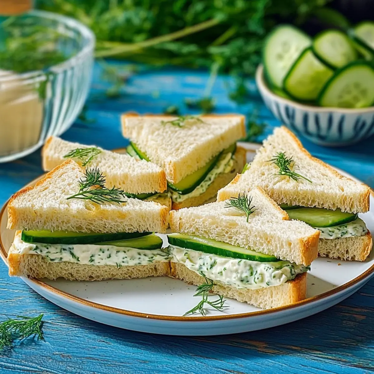 Cut each sandwich into four small pieces, either in rectangles or triangles, depending on your preference. Place the sandwiches on a serving platter, arranging them neatly. Their delicate, inviting appearance will surely grab attention. For an extra touch, garnish with additional dill or cucumber slices to elevate your presentation.