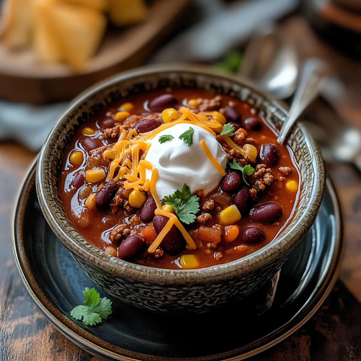 Tortilla Chips: Crunchy and salty, tortilla chips provide the perfect contrast to the rich, savory chili. Dip them right into your bowl for a satisfying bite.