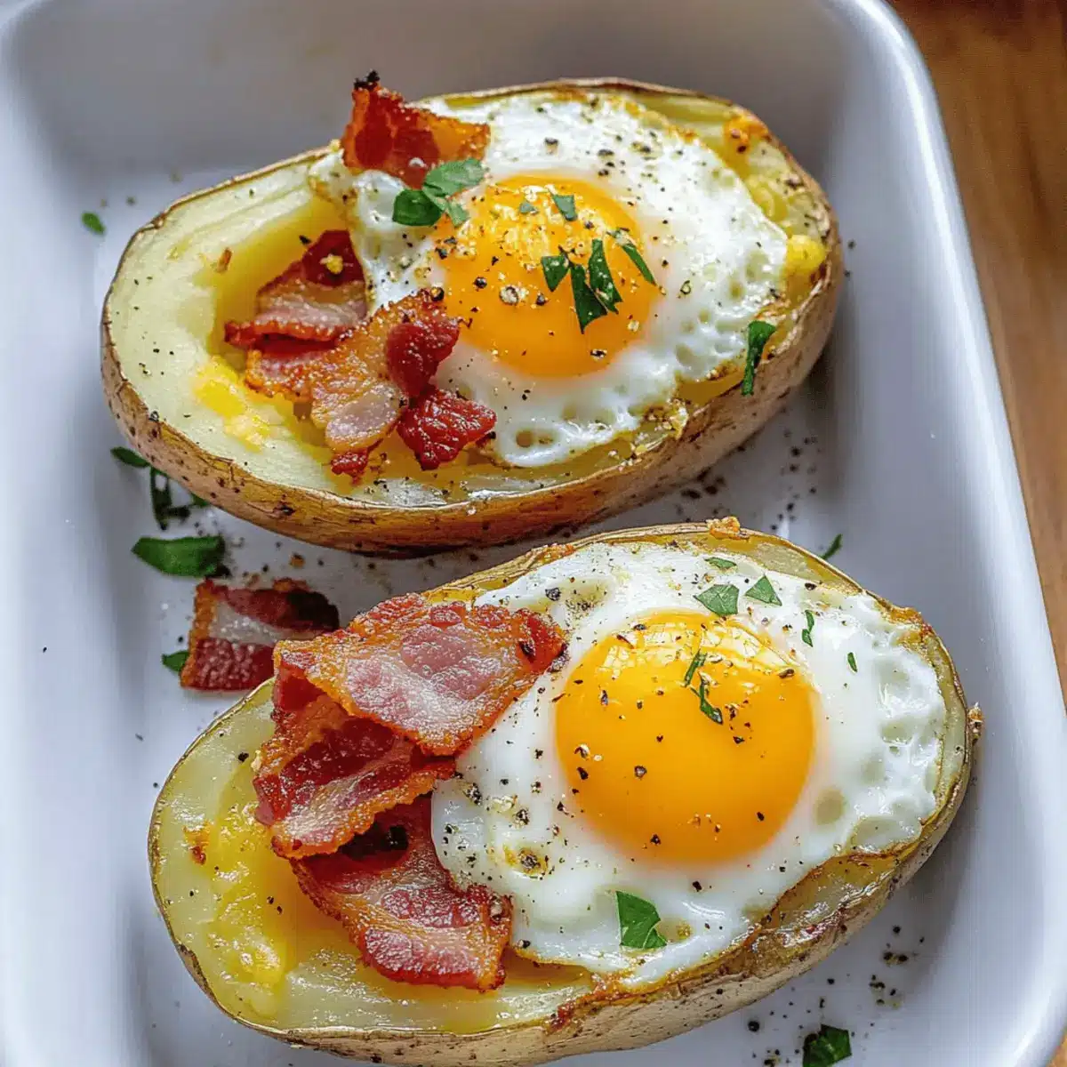 Once baked, remove these delightful potato boats from the oven and let them cool for a minute. Garnish with freshly sliced chives for a pop of color and a fresh onion flavor that complements the dish beautifully. Serve hot, and enjoy the wonderful layers of flavors and textures in your Double Baked Bacon and Egg Potatoes!