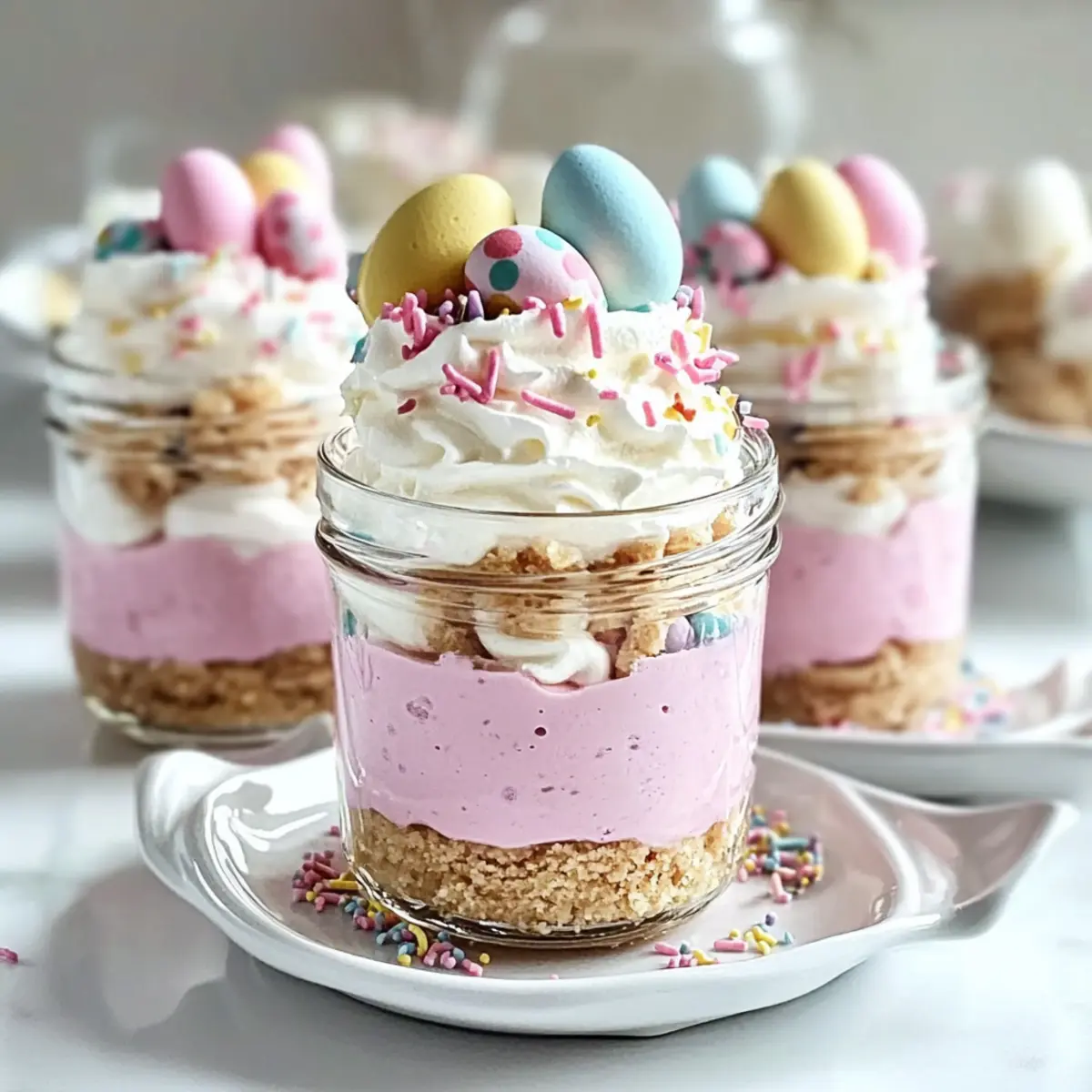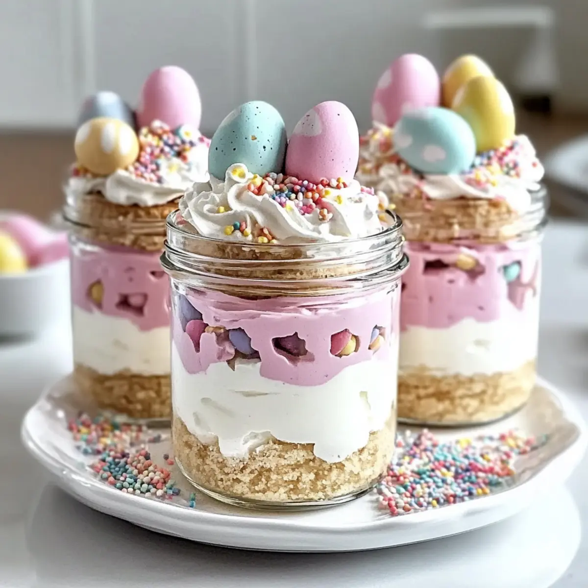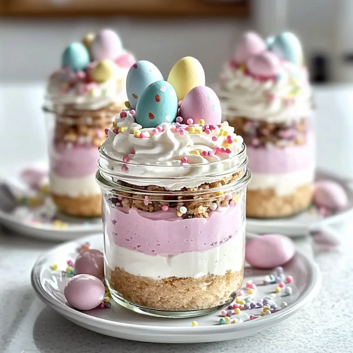 Pipe a generous swirl of whipped cream on top of each jar for a delightful finish. Decorate with pastel candy eggs and rainbow or pastel sprinkles, making your Easter Egg Cheesecake Jars festive and inviting. Cover the jars and refrigerate for at least 2 hours, allowing the cheesecake to set perfectly for a delightful spring treat.