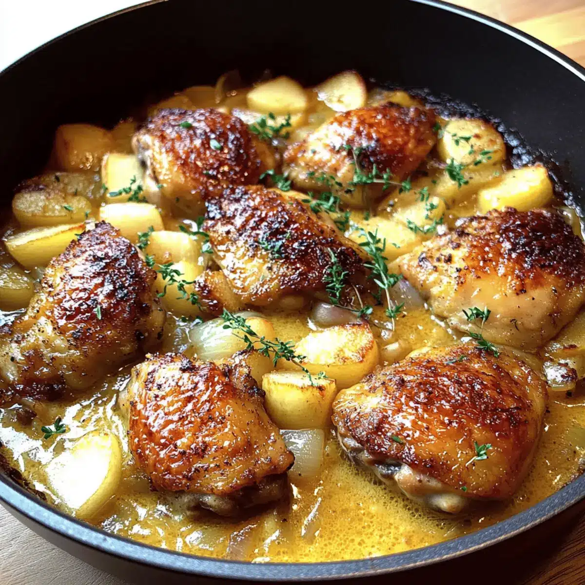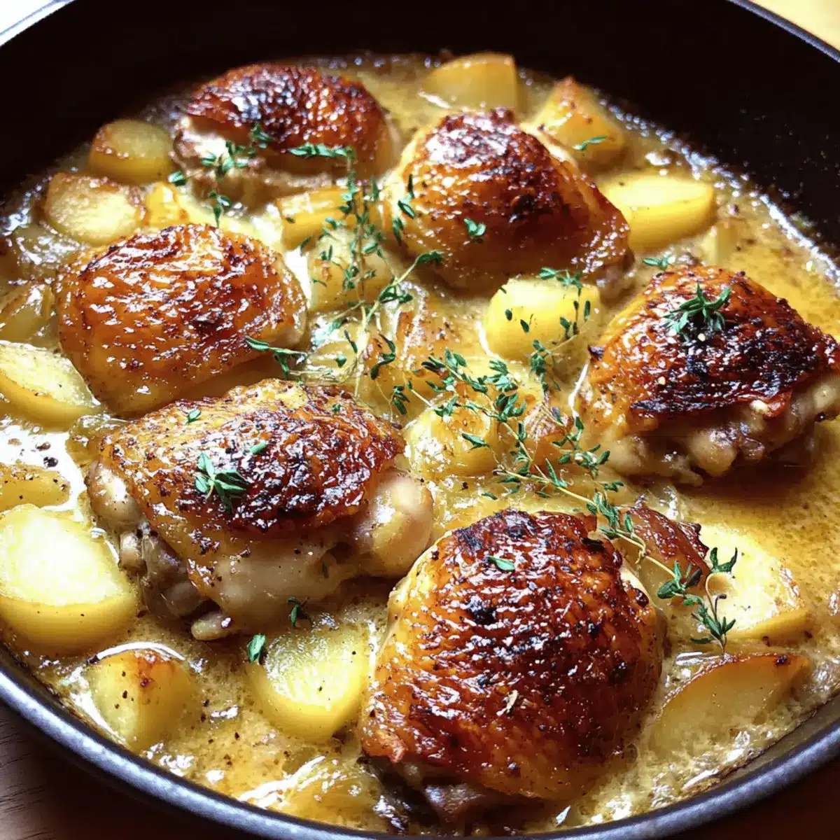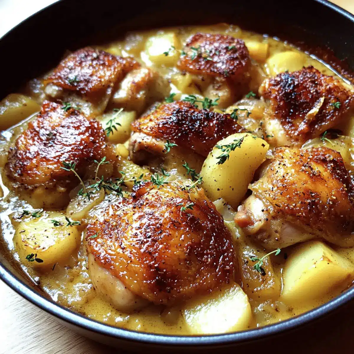 Preparing the Creamy French Style Chicken Casserole a la Normande ahead of time is a fantastic way to save on those busy weeknights! You can brown the chicken and sauté the onions and apples up to 24 hours in advance, allowing the flavors to deepen. Just refrigerate them in an airtight container to maintain quality. When you’re ready to enjoy this comforting dish, simply layer the prepped ingredients back in the skillet, pour over the heavy cream, sprinkle with thyme, and bake for 30-35 minutes. This way, you’ll have a warm, satisfying meal ready to serve with minimal effort!