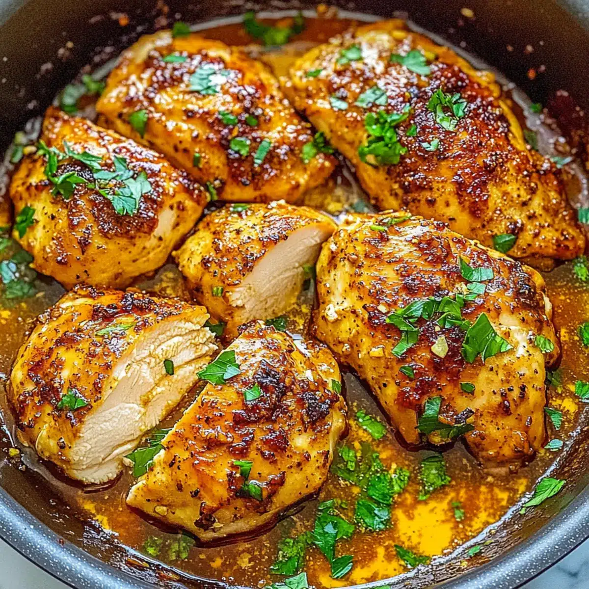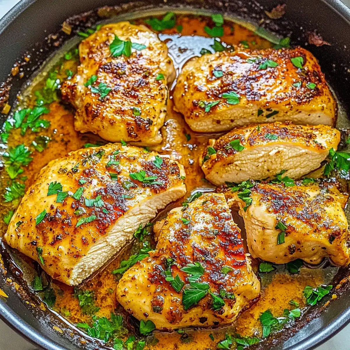 A sizzling skillet filled with tender chicken in a golden garlic butter sauce creates the perfect stage for an unforgettable meal.