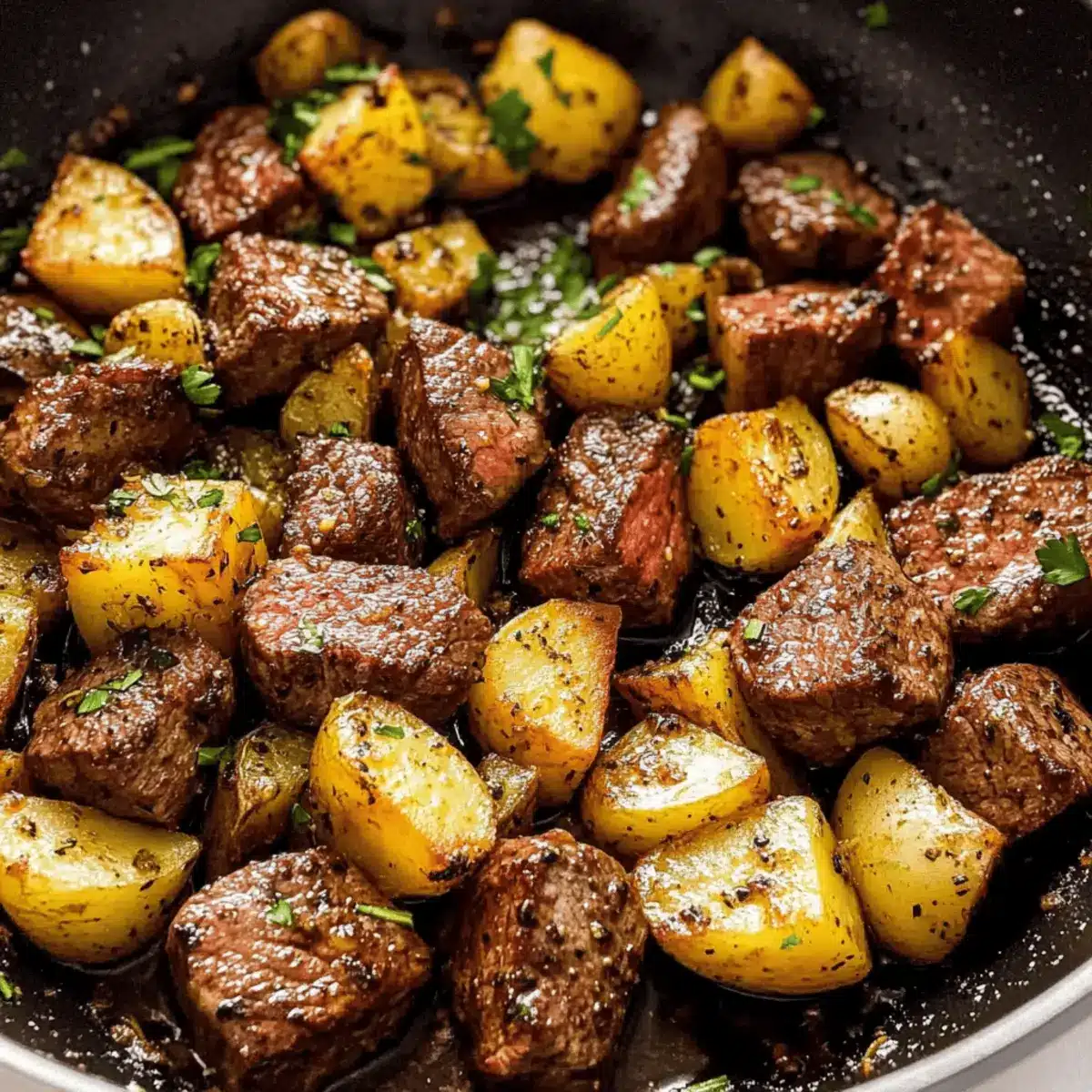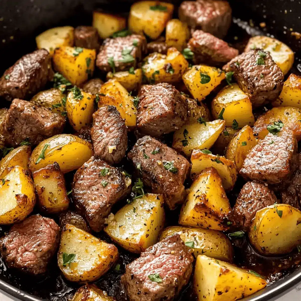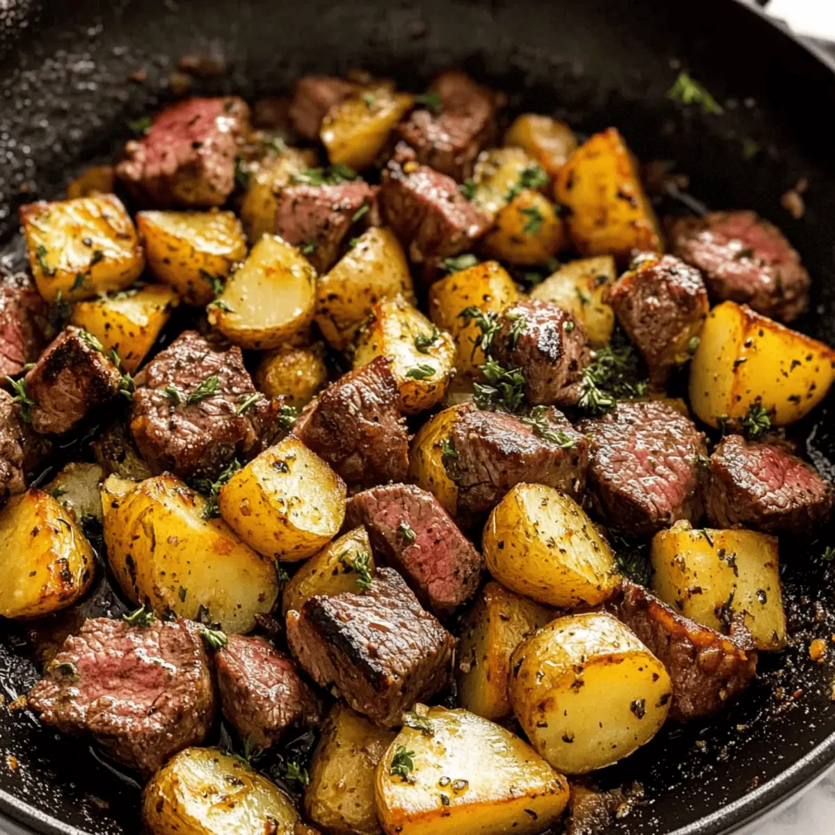 Return the sautéed potatoes to the skillet with the garlic butter steak bites. Gently mix everything together and cook for an additional minute, allowing the potatoes to reheat and absorb the delicious flavors from the steak. The final dish should look enticingly golden and aromatic, ready to serve.