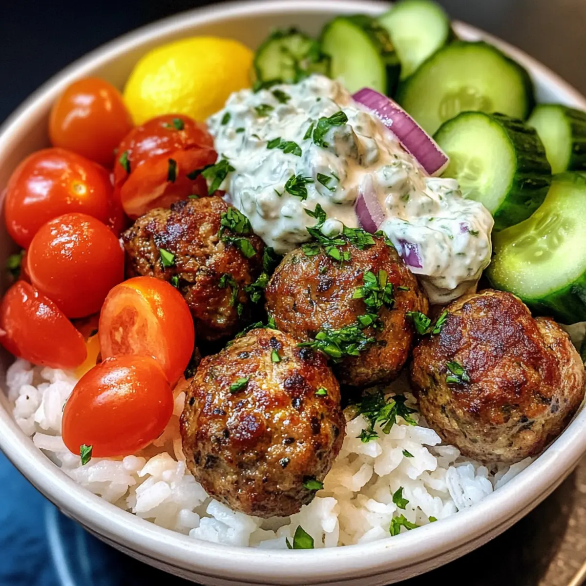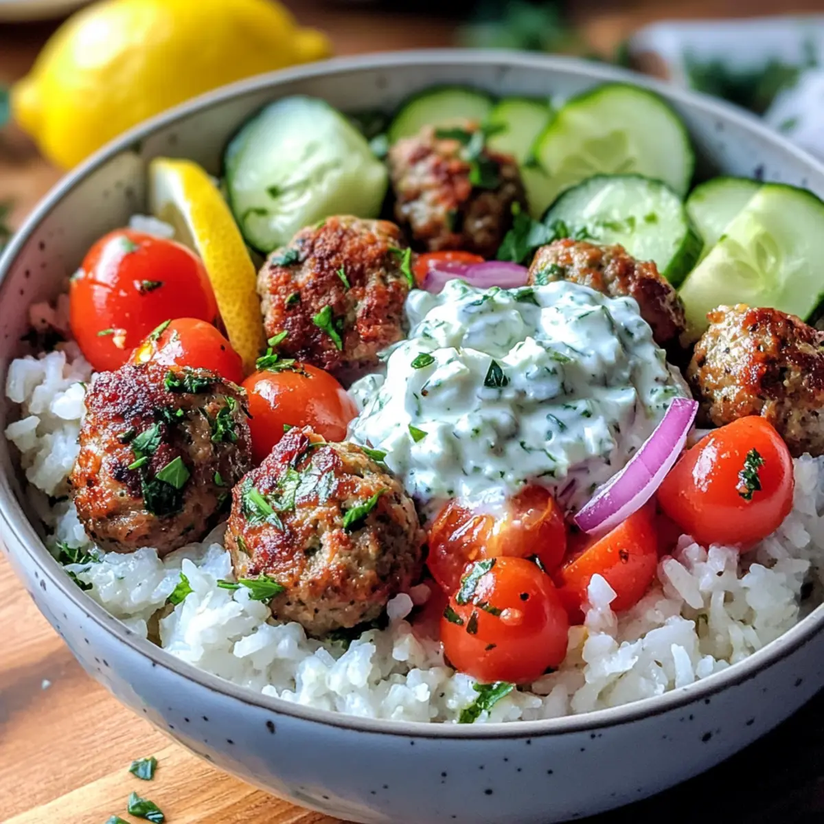 - Assemble the bowls with rice, fresh veggies, and meatballs, and drizzle with tzatziki sauce, finishing with fresh lemon juice.