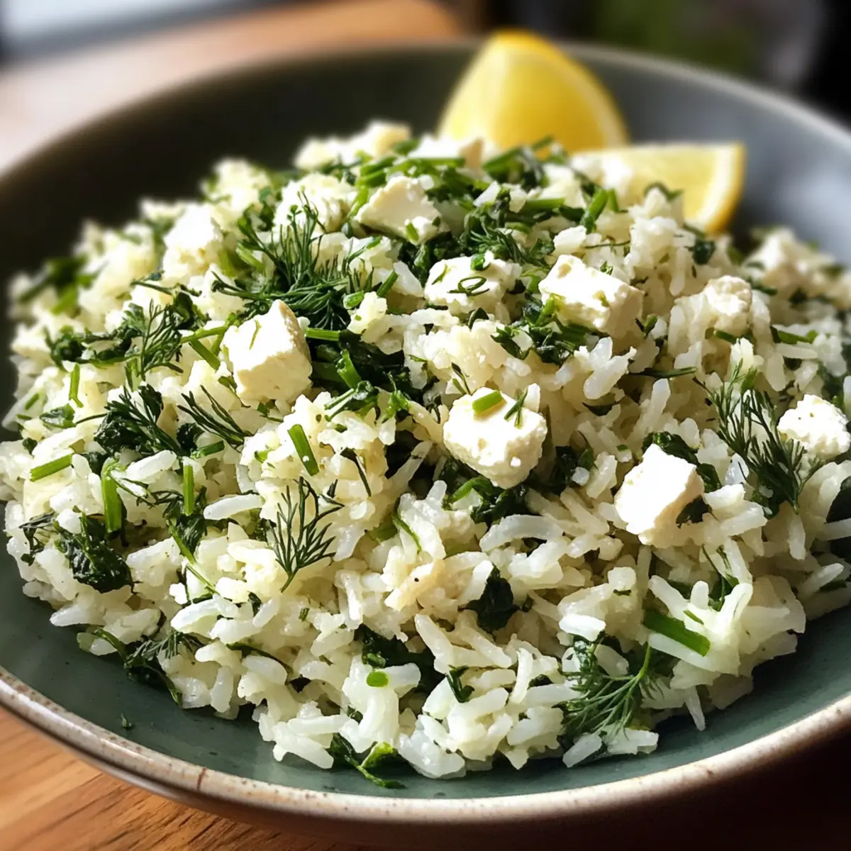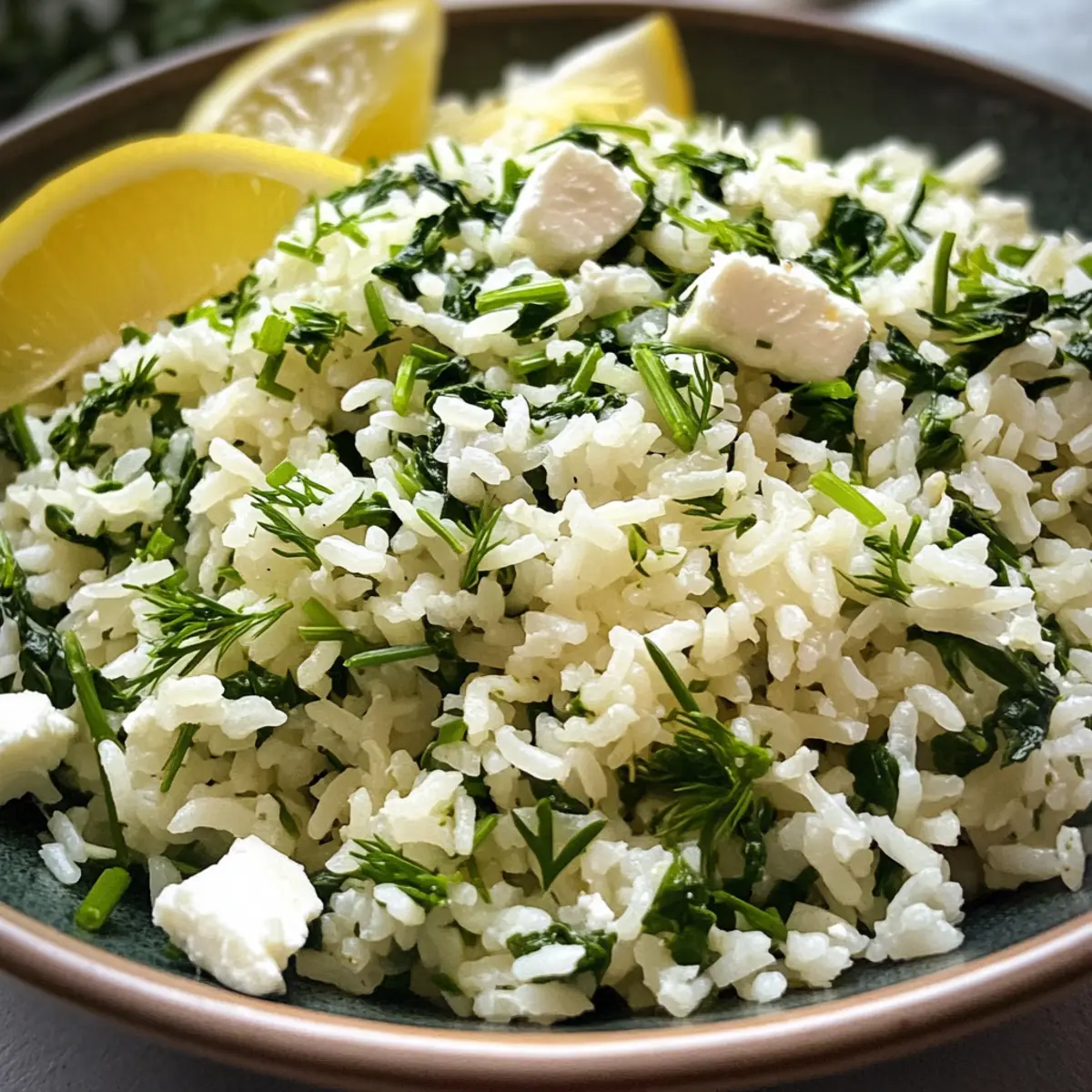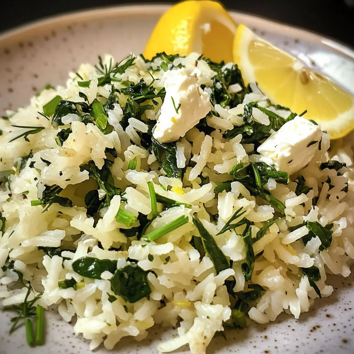 - Serve the Greek Spinach Rice garnished with crumbled feta cheese and extra lemon wedges.