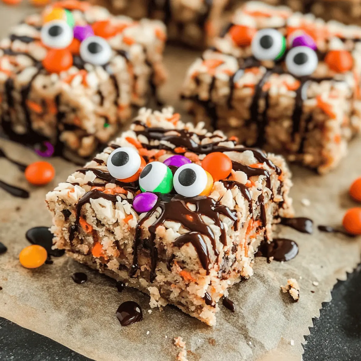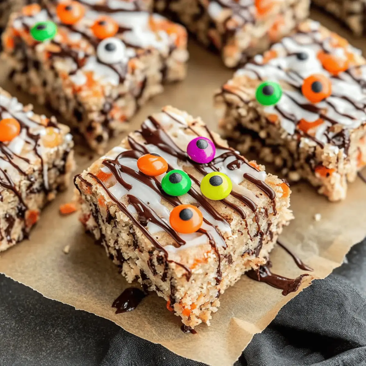 Once cooled, use a sharp knife to cut the HALLOWEEN RICE CRISPY TREATS into squares or fun shapes using cookie cutters. Now comes the fun part! Drizzle melted chocolate over your shapes and add candy eyes or sprinkles to create ghoulish designs. This step lets you personalize each treat, enhancing the Halloween spirit.