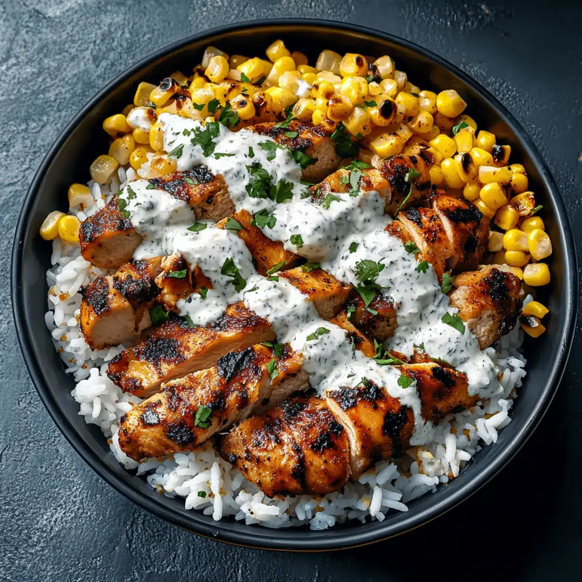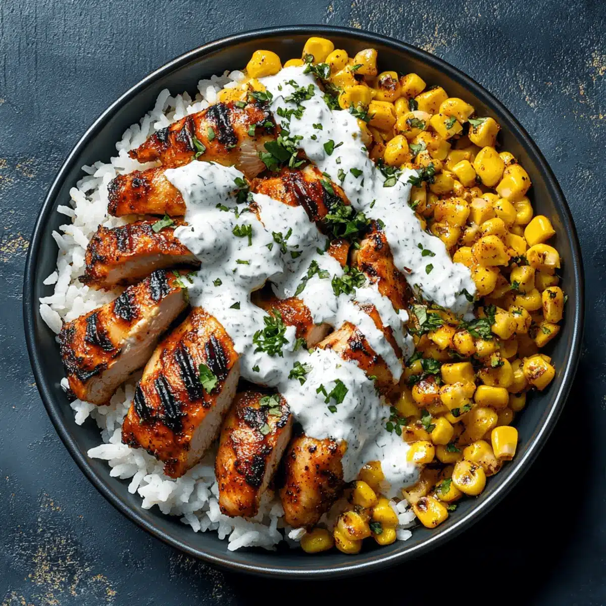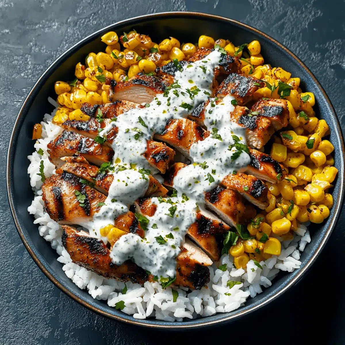 - Assemble bowls with rice, grilled chicken, charred corn, and drizzle sauce on top, finishing with Cotija cheese and lime wedges.