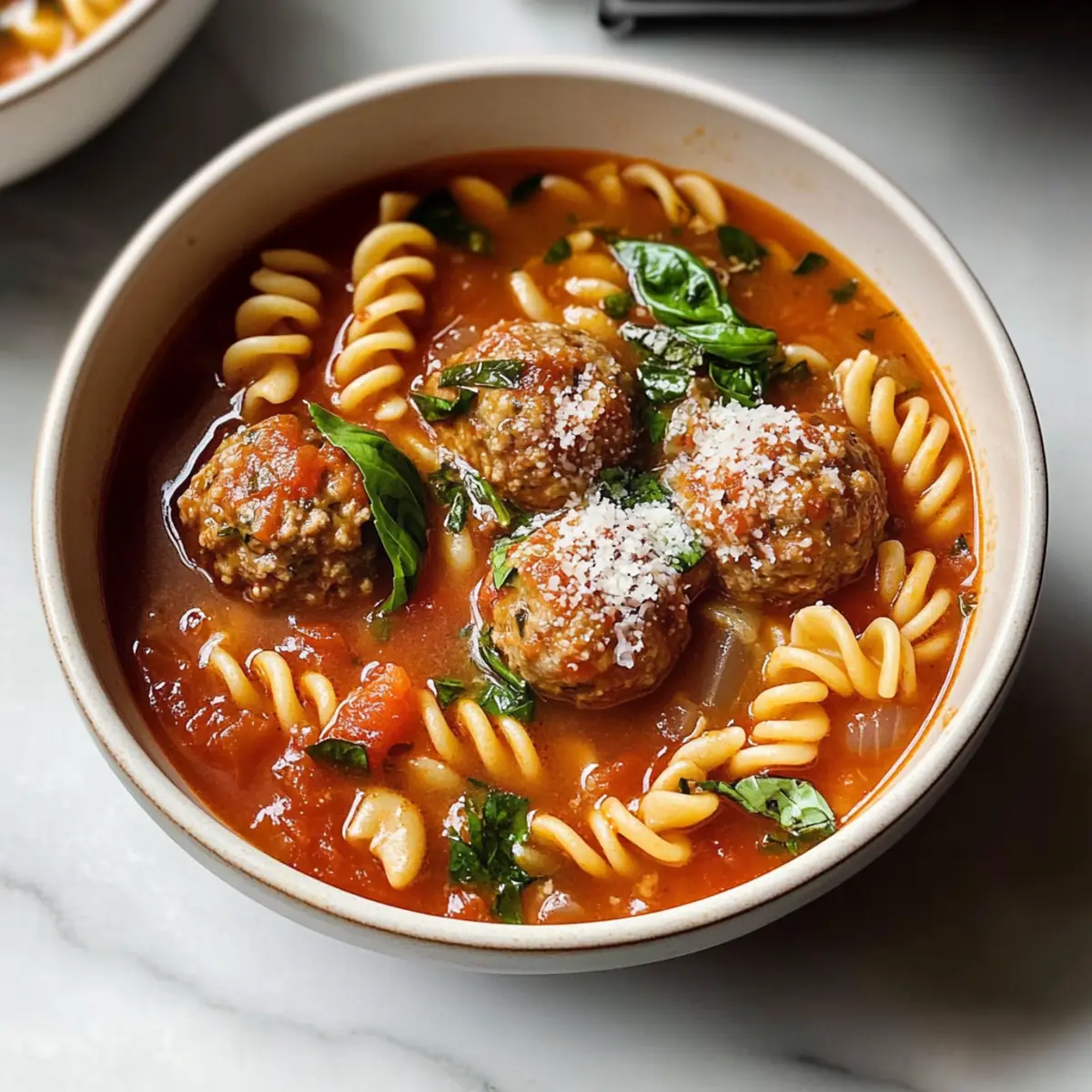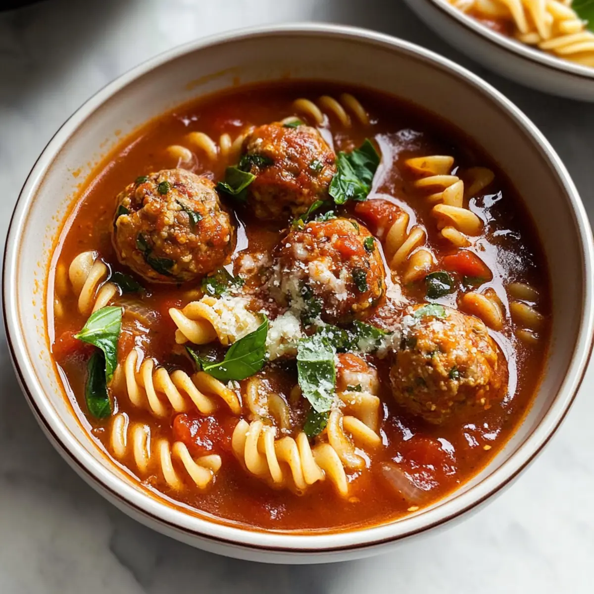 Flavor Explosion: The rich tomato broth, combined with fresh basil and savory meatballs, creates a symphony of robust flavors with every spoonful.