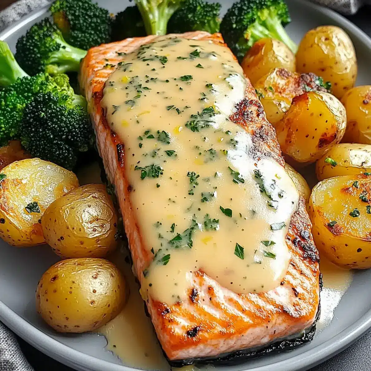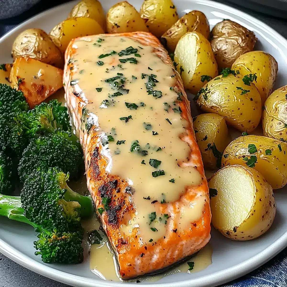 - Serve the salmon with crispy potatoes and roasted broccoli, drizzling with lemon butter sauce and garnishing with lemon slices and parsley.