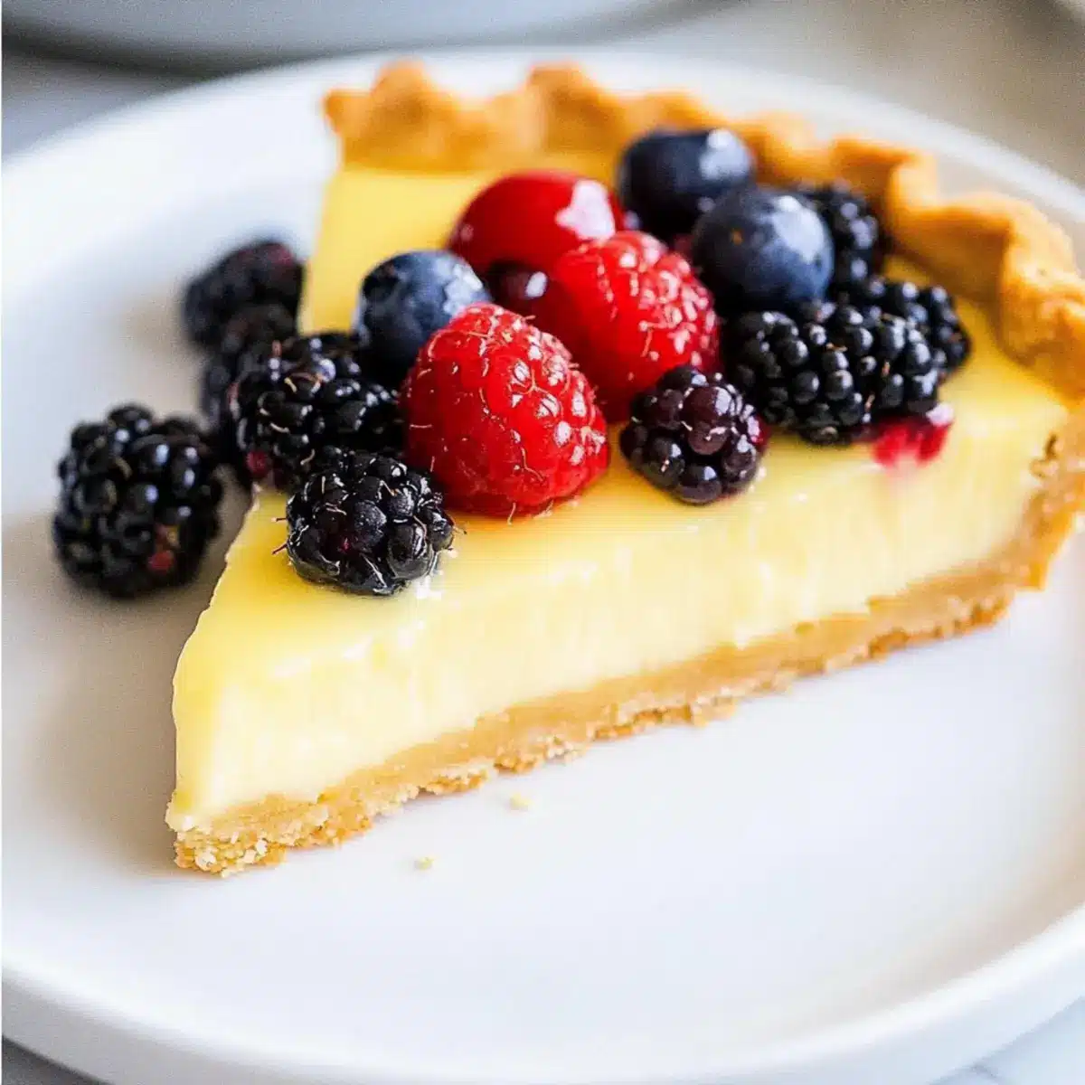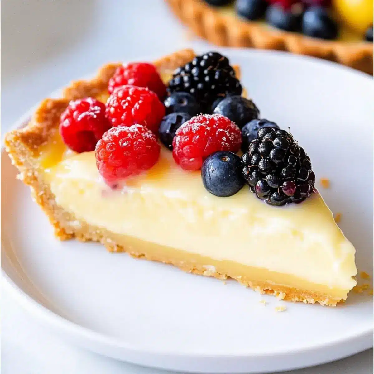 Fresh Berries: A mix of strawberries, blueberries, and raspberries enhances the tart with juicy sweetness and vibrant color, creating a refreshing contrast.