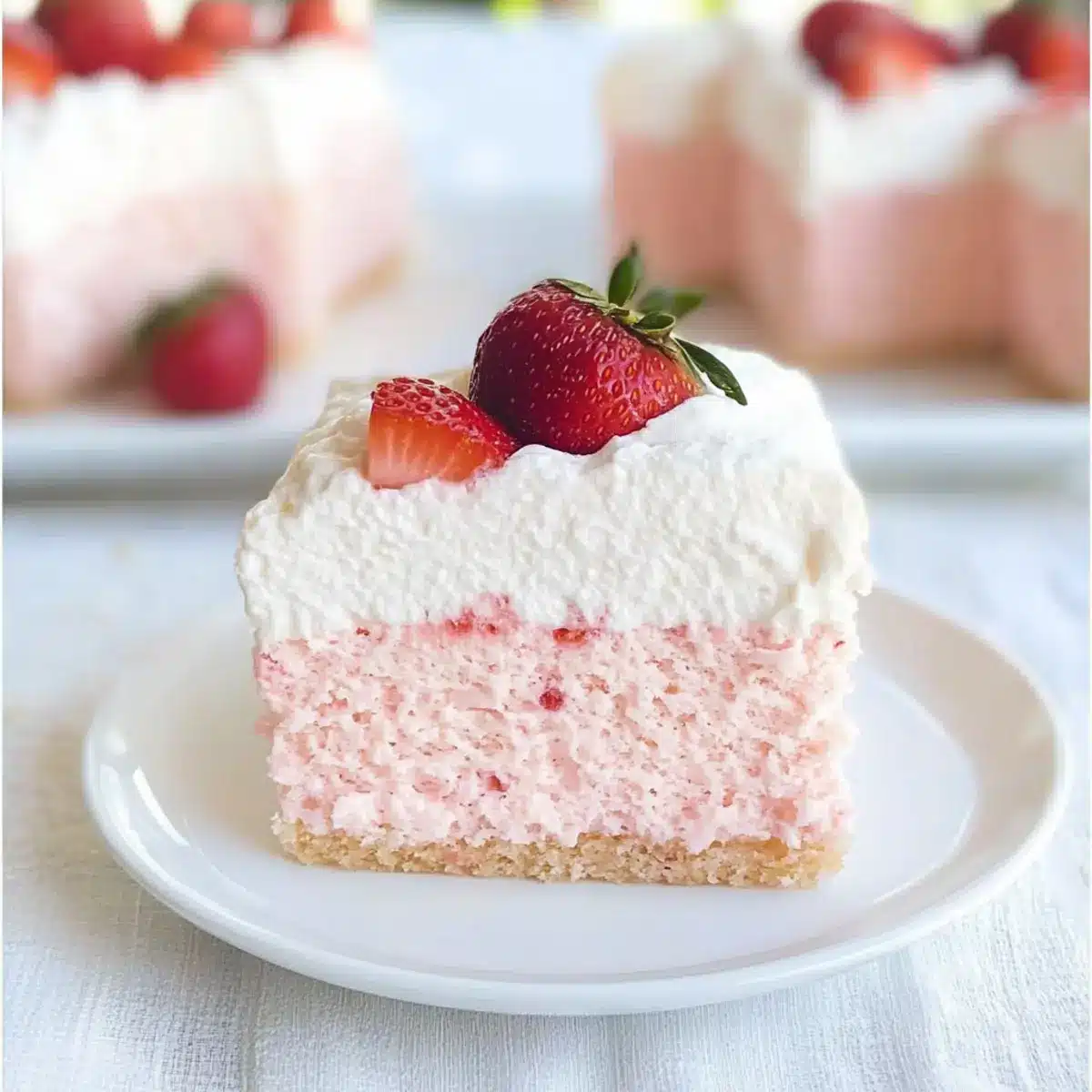 Once set, remove the cake from the pan by lifting the parchment paper. Cut into squares and serve chilled, optionally topping with freshly whipped cream and extra strawberry slices for a beautiful presentation. This light dessert is best enjoyed straight from the refrigerator, making it a perfect treat for any warm gathering!