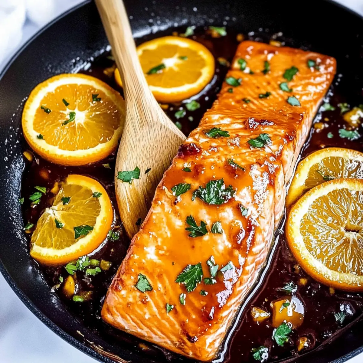 - Return salmon to the skillet with the orange glaze and spoon the sauce over the top. Optionally, add fresh orange slices.