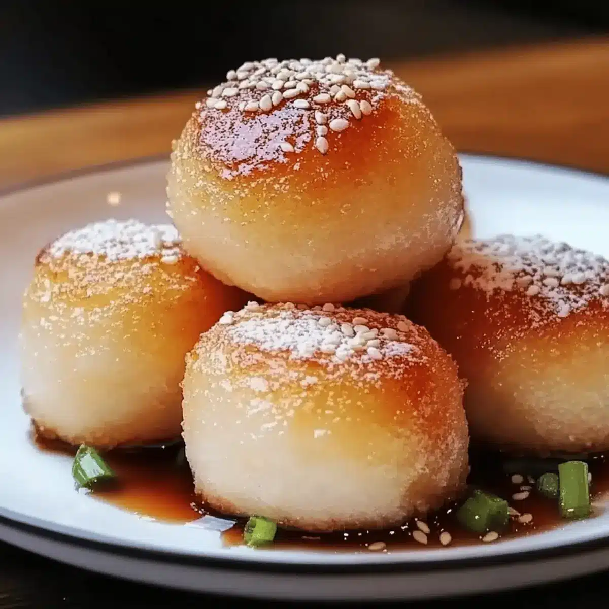 Once fried, remove the Potato Mochi Rolls from the oil and drain them on paper towels. While still warm, drizzle with soy sauce for a savory touch, and sprinkle with sesame seeds and chopped green onions for extra flavor and crunch. Serve these unique rolls immediately, allowing everyone to savor the delightful fusion of crispy and chewy textures.
