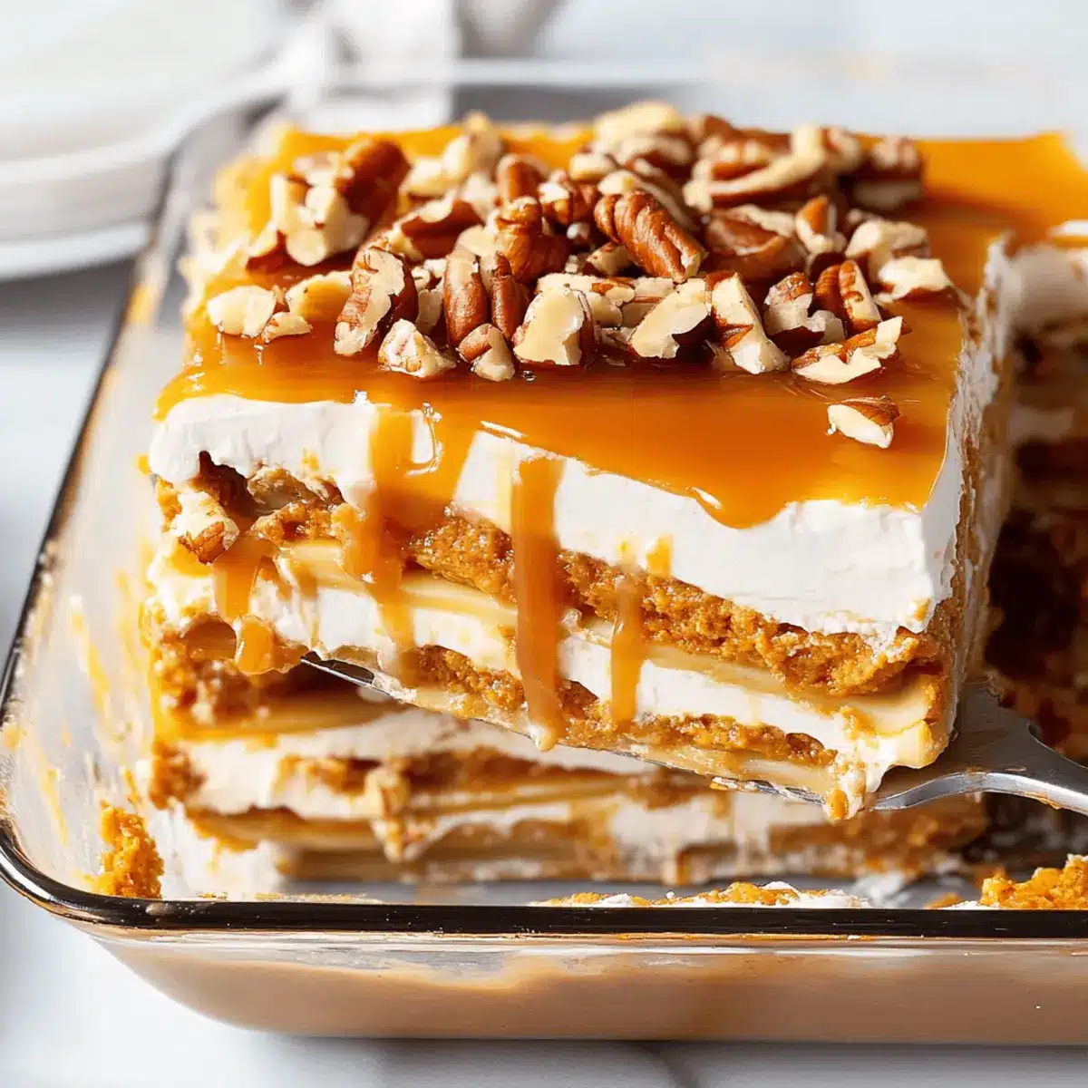 Now it’s time to slice your Pumpkin Cheesecake Lasagna into squares. Use a sharp knife to cut through the layers smoothly. Serve chilled, and consider offering extra caramel sauce on the side for drizzling tableside. Your beautiful, no-bake creation is ready to impress friends and family at your autumn gathering!