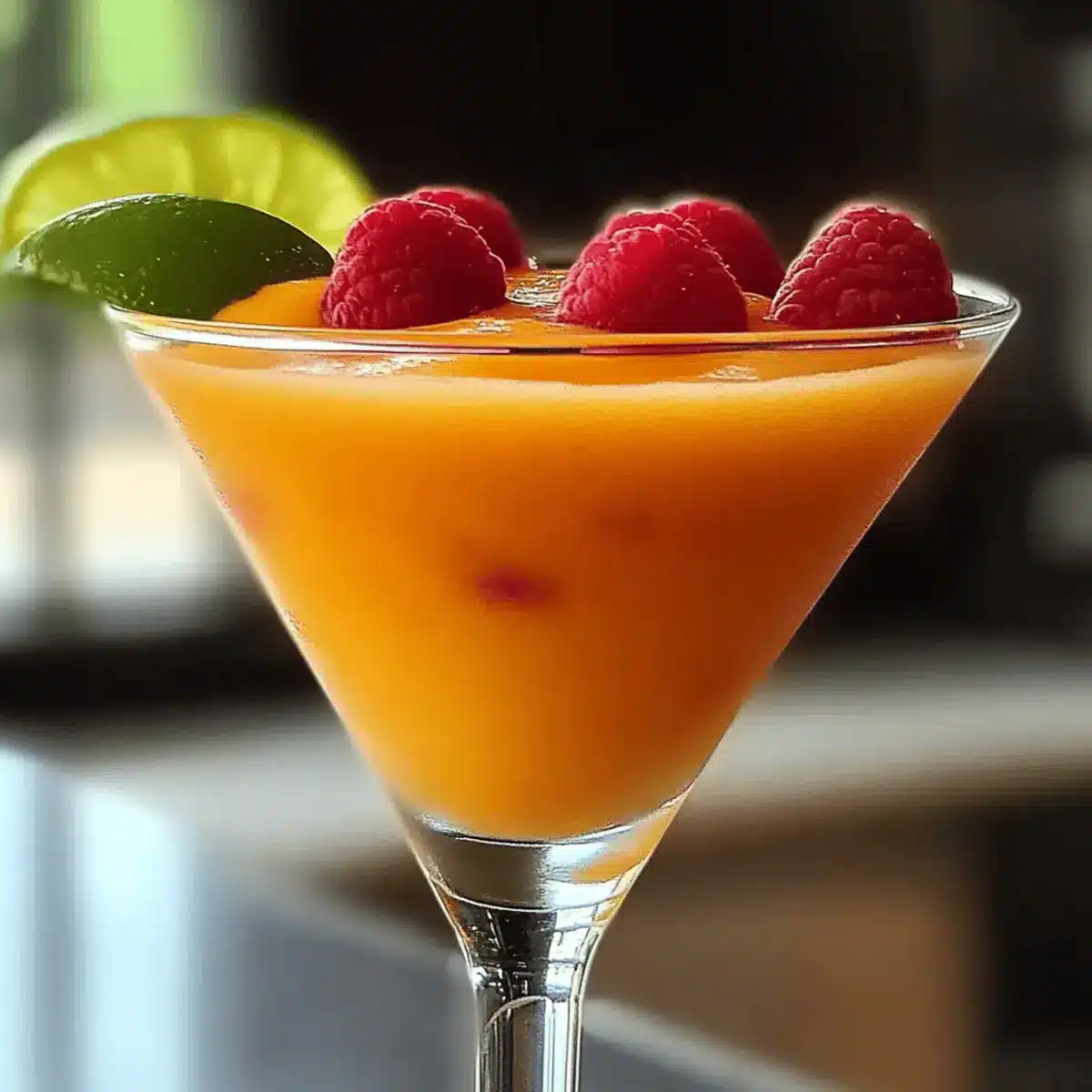 - Pour the mixture into chilled glasses, filling each about three-quarters full, and garnish with fresh raspberries and a lime wedge.