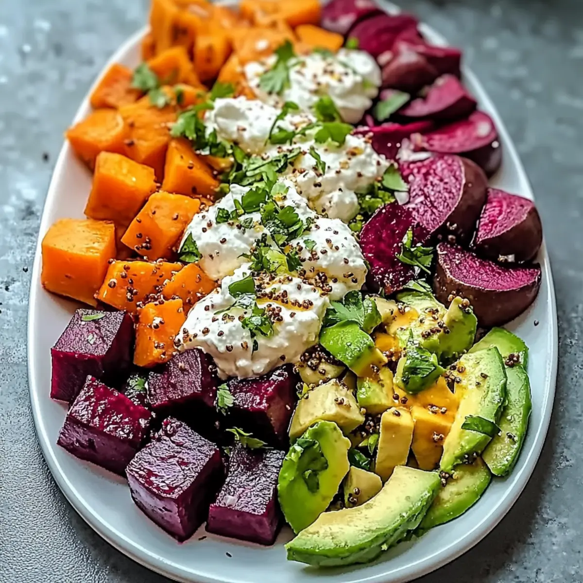 - Assemble the salad by starting with greens, layering roasted beets, sweet potatoes, sliced avocado, and whipped ricotta.