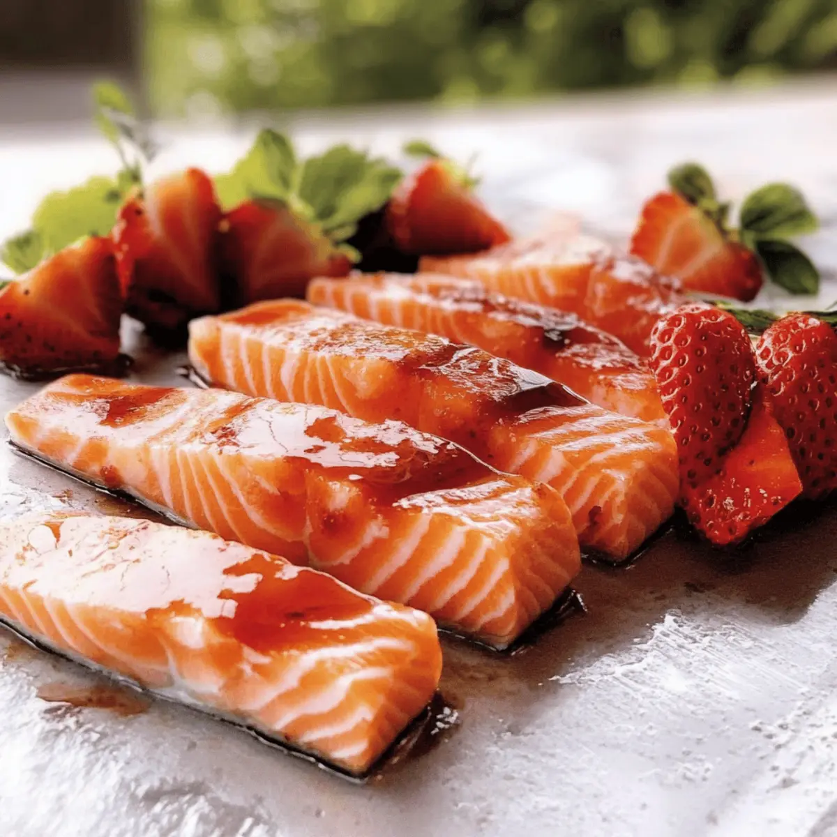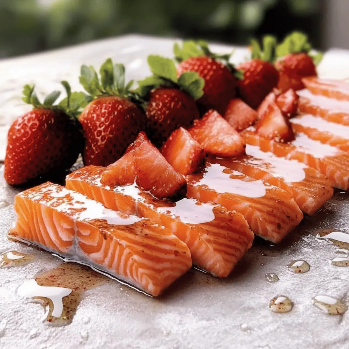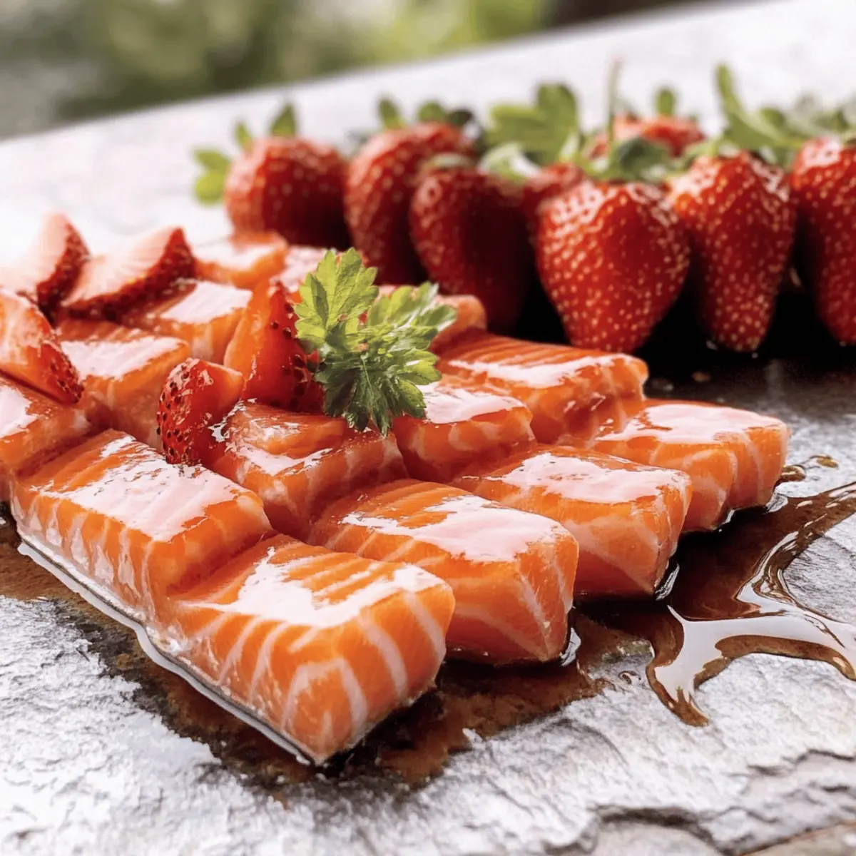 - Arrange the sliced salmon on a plate, drizzle with strawberry miso sauce, and garnish with fresh sliced strawberries.