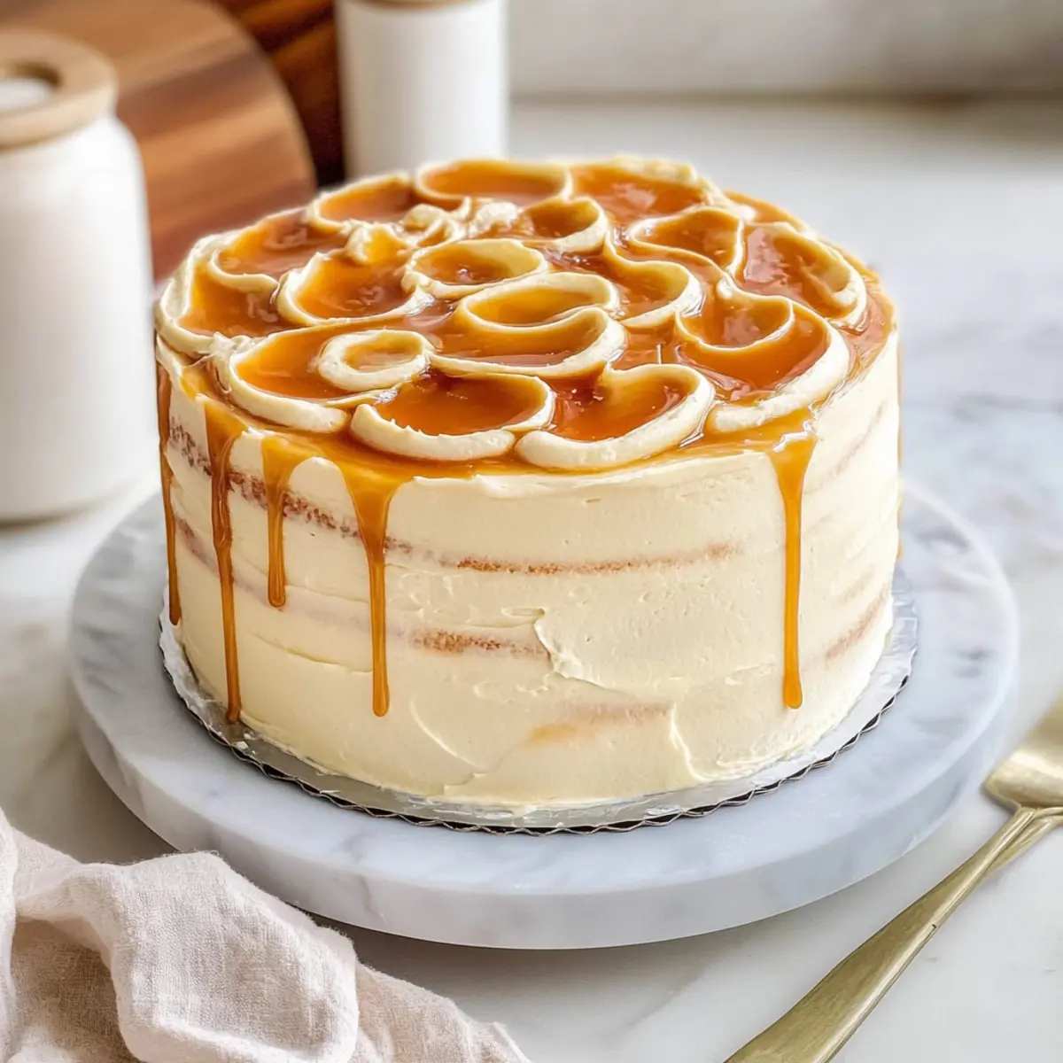 - Once the cake layers are completely cooled, place one layer on a serving plate. Spread a layer of caramel buttercream on top, followed by a drizzle of the homemade caramel. Repeat with the second layer, adding more buttercream and caramel. Place the final layer on top and apply a crumb coat of buttercream around the entire cake. Chill in the fridge for 20 minutes to set before finishing the exterior.