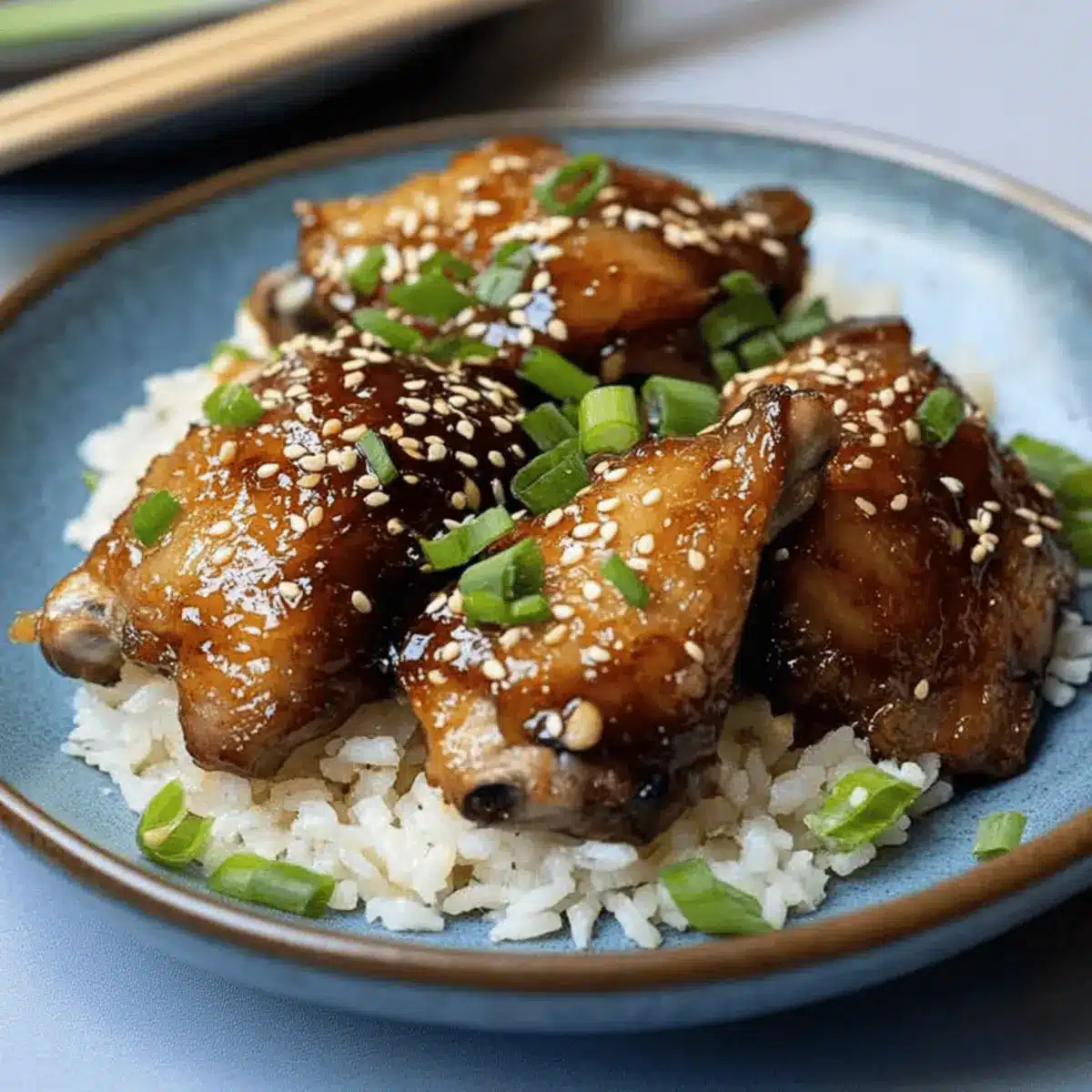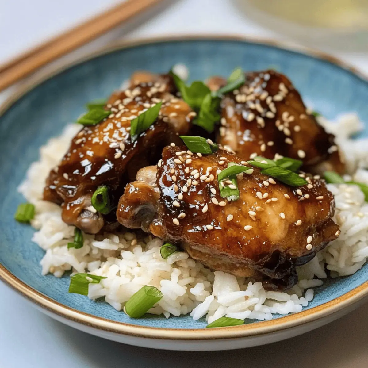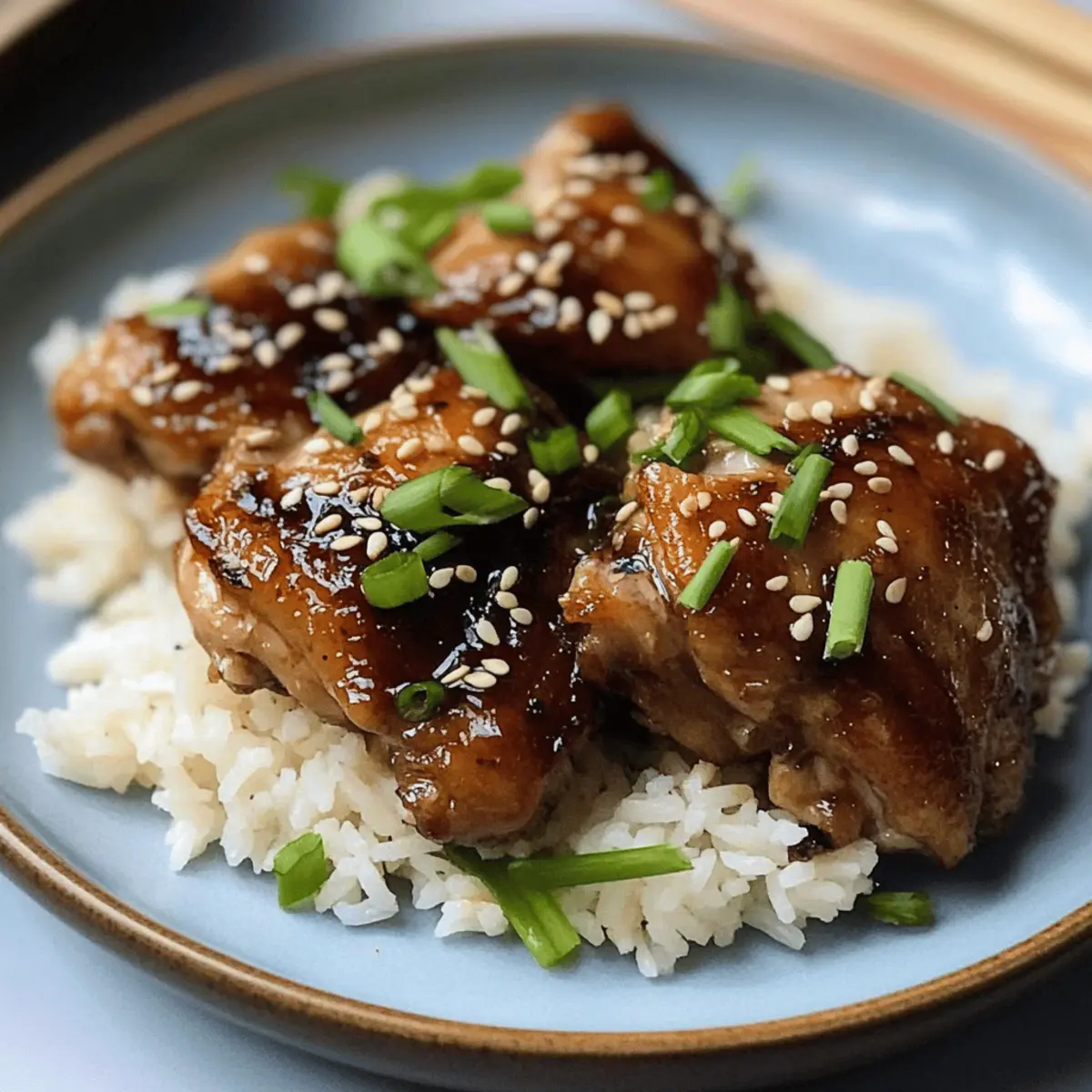 - Serve chicken over cooked rice, drizzle with thickened sauce, and garnish with green onions and sesame seeds.