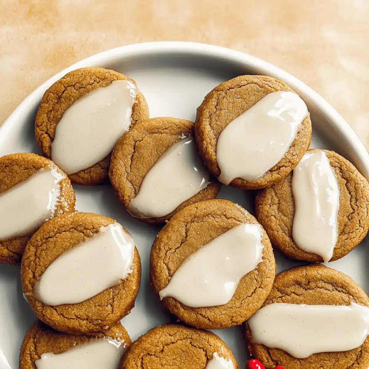 After the cookies have cooled, prepare the maple glaze by whisking together 1 cup of sifted powdered sugar and ¼ cup of pure maple syrup until smooth. Dip half of each cookie into the glaze, allowing any excess glaze to drip off, and place them back on the wire rack. This sweet maple glaze adds an irresistible touch, enhancing your Soft Gingerbread Cookies’ festive appeal!