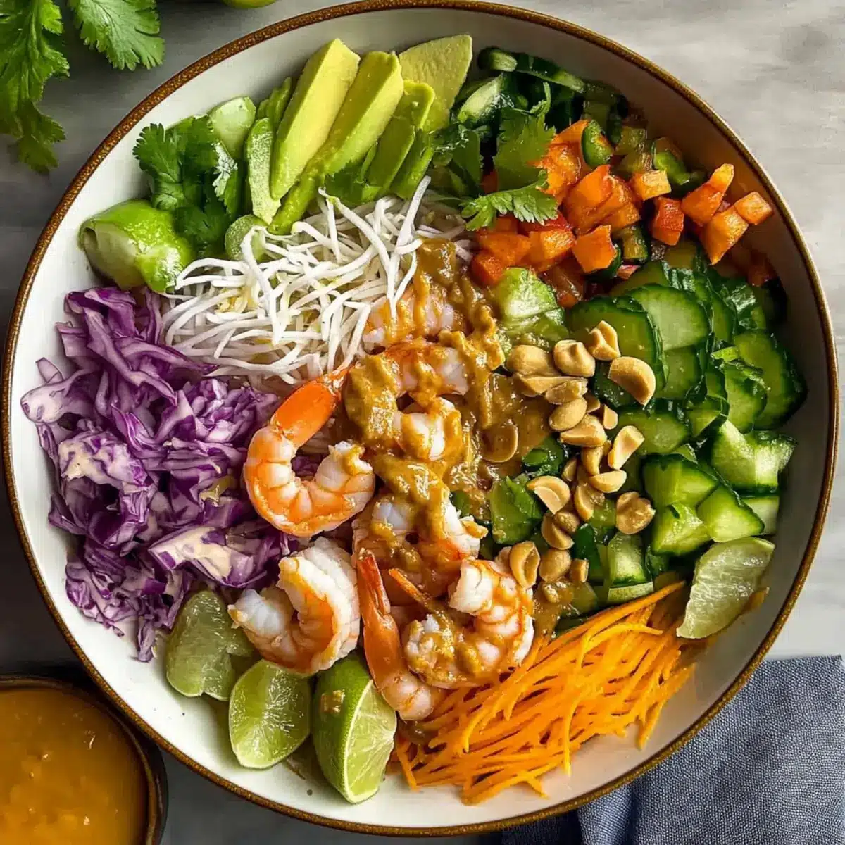 In a large mixing bowl, combine your chilled vermicelli noodles with shredded purple cabbage, diced cucumbers, shredded carrots, and finely chopped jalapeño. Add sliced avocado, sliced green onions, chopped cilantro, and fresh mint to this mixture. Finally, toss in the cooked shrimp, allowing all the vibrant ingredients to harmonize and showcase the freshness of the Spring Roll Salad.
