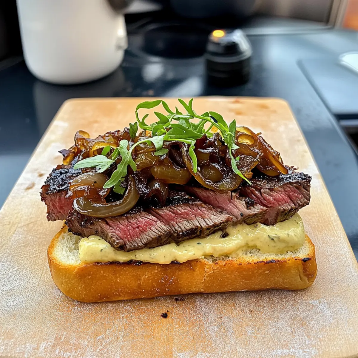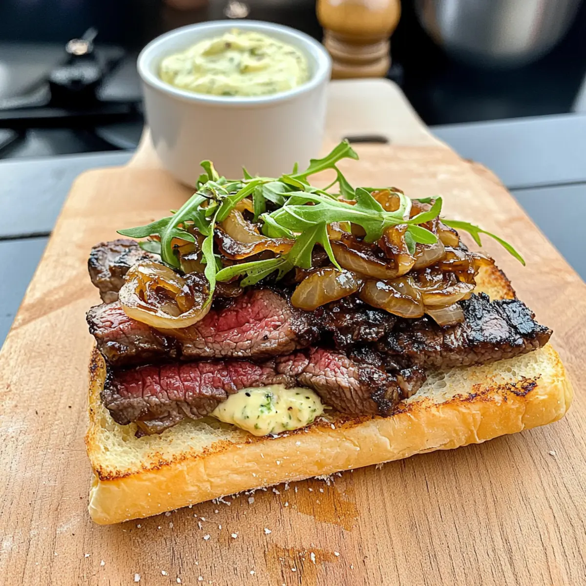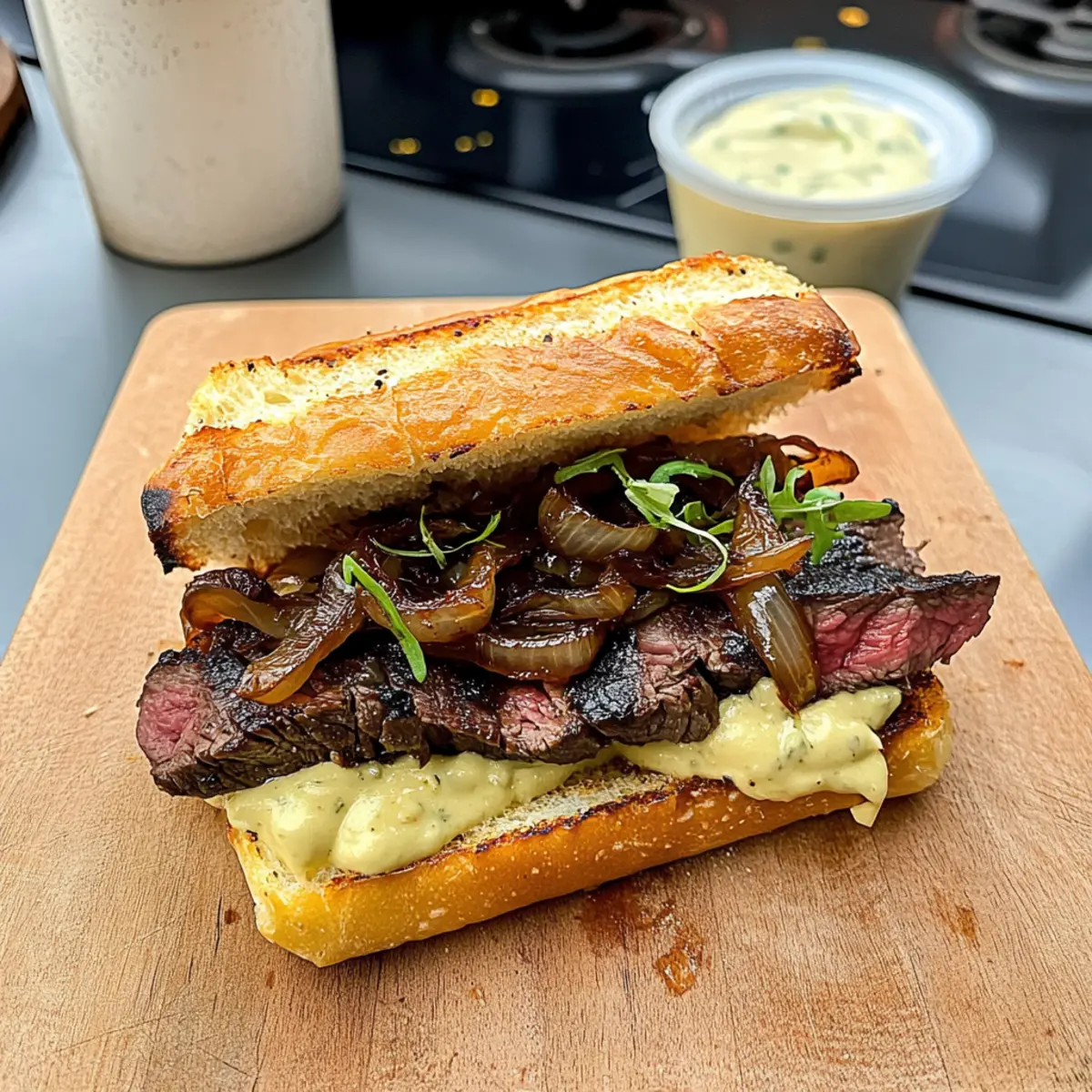 - Let the steak rest for 5 minutes before slicing. Spread the roasted garlic aioli on toasted ciabattas, layer steak, caramelized onions, and fresh rocket.
