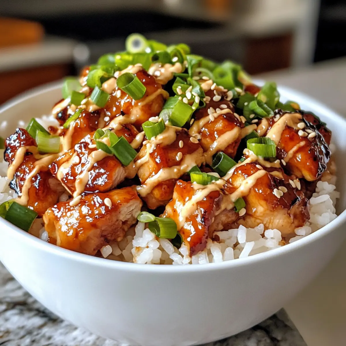To assemble your Sticky Chicken Rice Bowls with Spicy Mayo, start with a generous scoop of fluffy jasmine rice as the base. Top with the glaze-coated chicken, and drizzle a liberally creamy, spicy mayo over the top. If desired, garnish with additional green onions and sesame seeds for an extra touch of color and crunch.