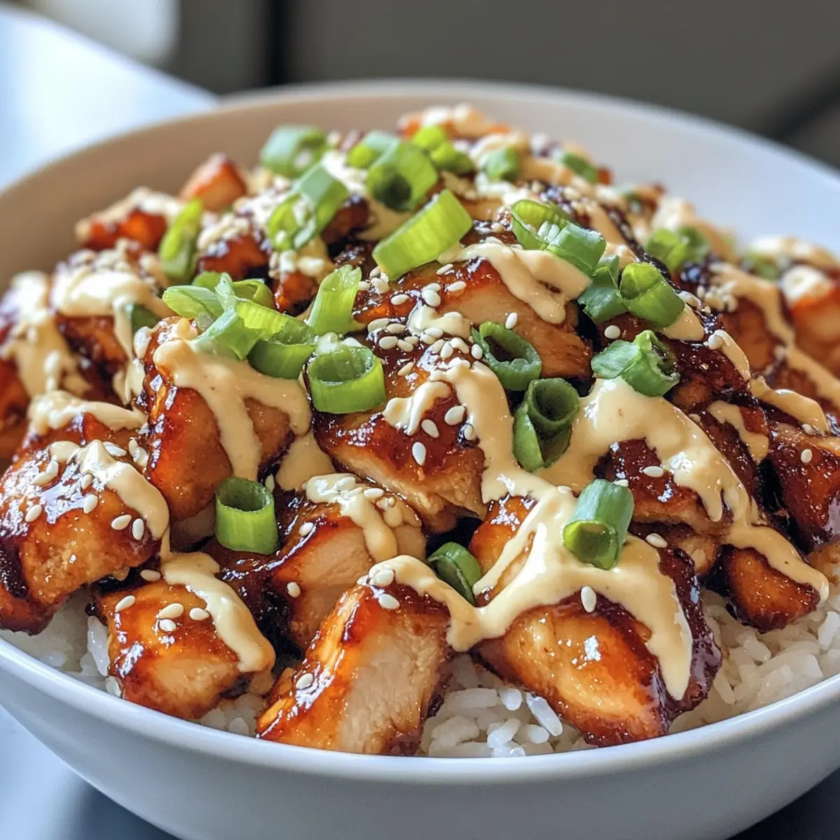 - To assemble, serve jasmine rice topped with chicken and drizzle spicy mayo over the top. Garnish with green onions and sesame seeds.