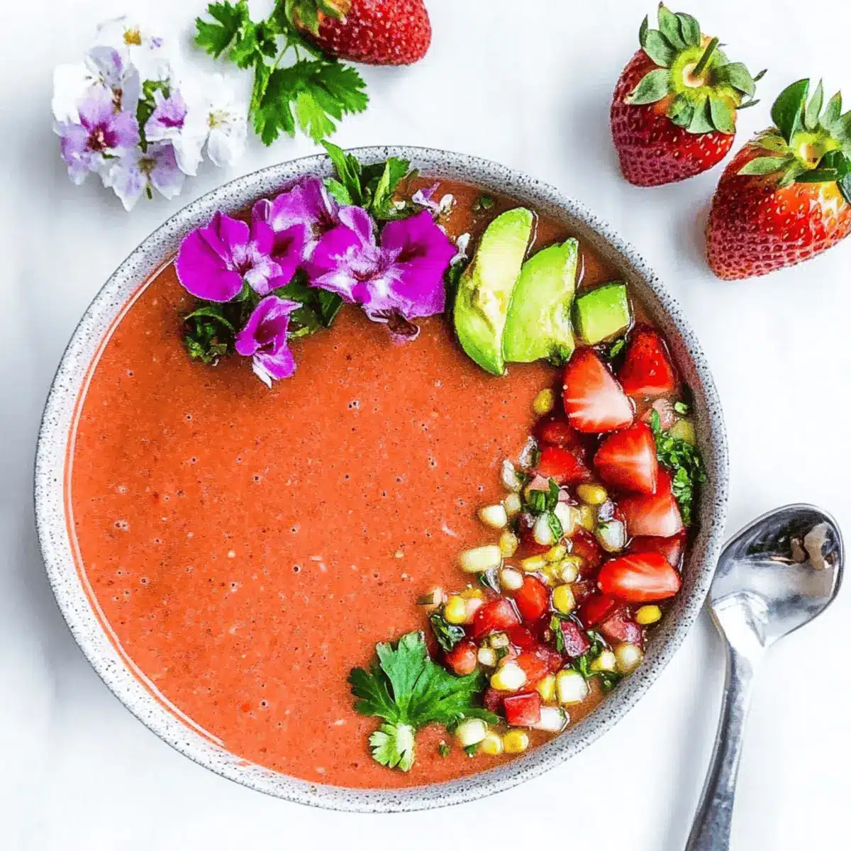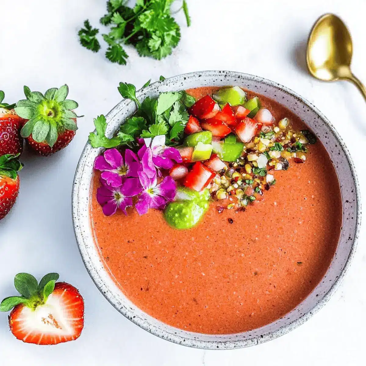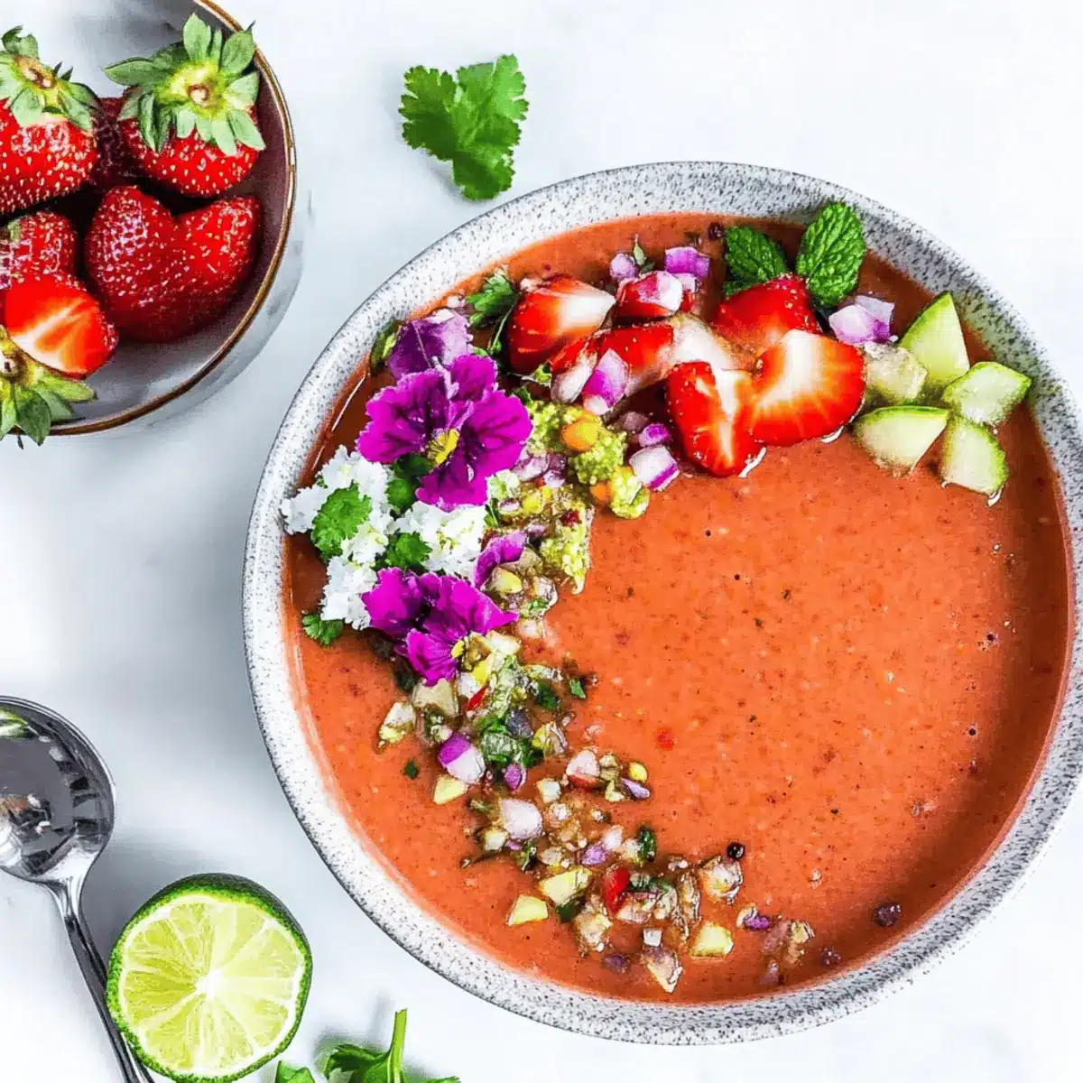 Once the gazpacho has chilled, give it a good stir for a final blend of flavors. Serve it in bowls, topped generously with the Strawberry Pico de Gallo for that extra freshness. This delightful Summer Strawberry Gazpacho is now ready to impress, bursting with vibrant flavors perfect for a hot day!