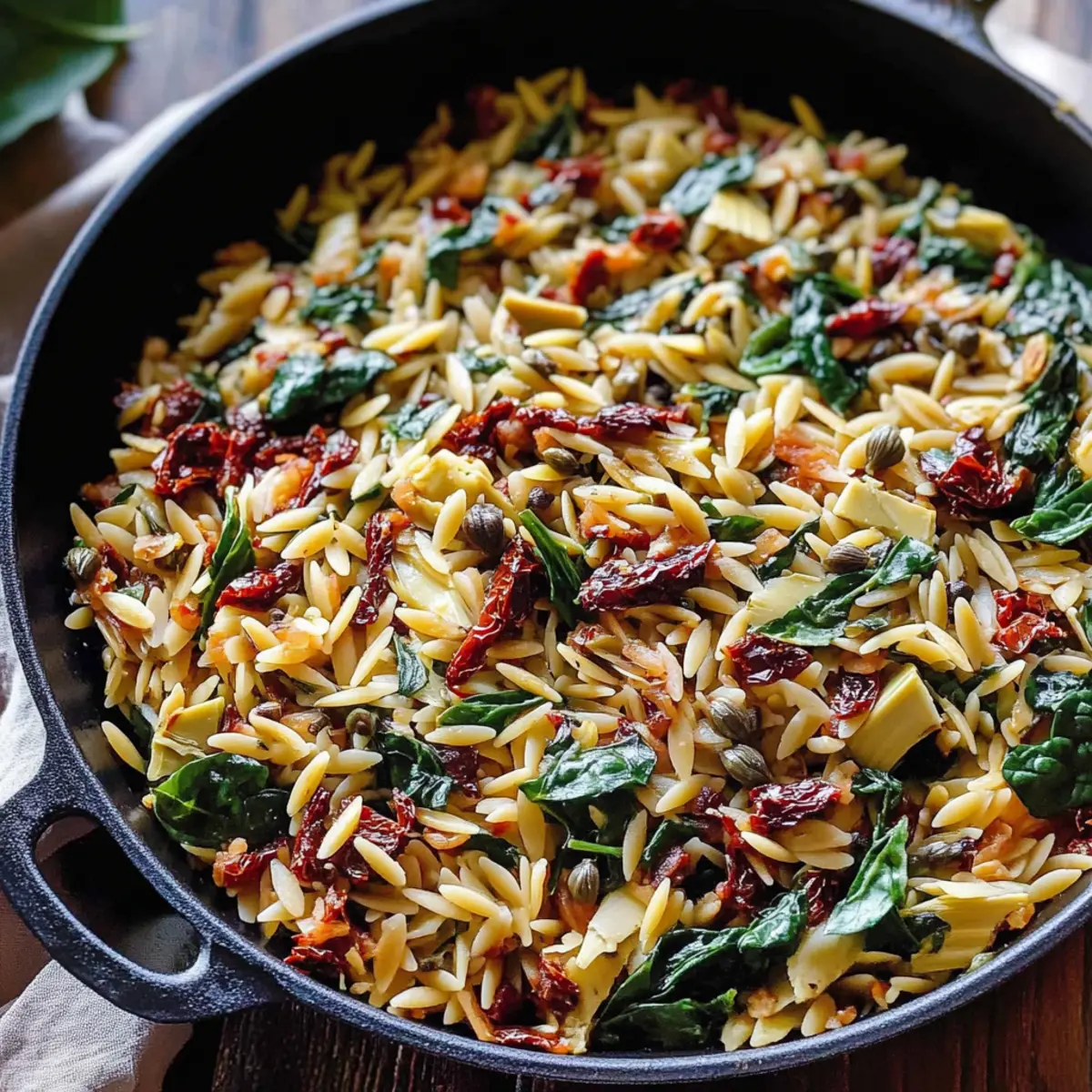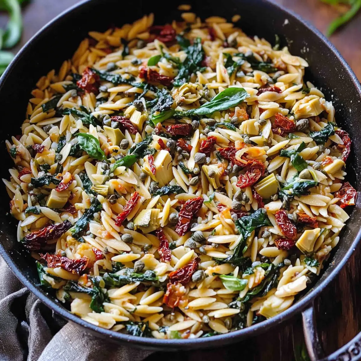 Taste your flavorful Sun-Dried Tomato and Spinach Orzo and adjust the seasoning as needed. Given the saltiness from the capers, sprinkle in a little salt if necessary, stirring well. Cook for a final 1–2 minutes on low heat as the flavors meld together beautifully. The dish should look inviting, with rich colors and a harmonious blend of ingredients.