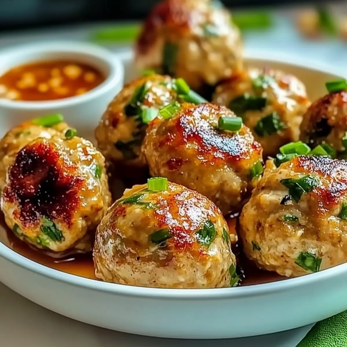 - Once cooked, remove meatballs from the oven, garnish with sliced green onions, and serve with the dipping sauce.