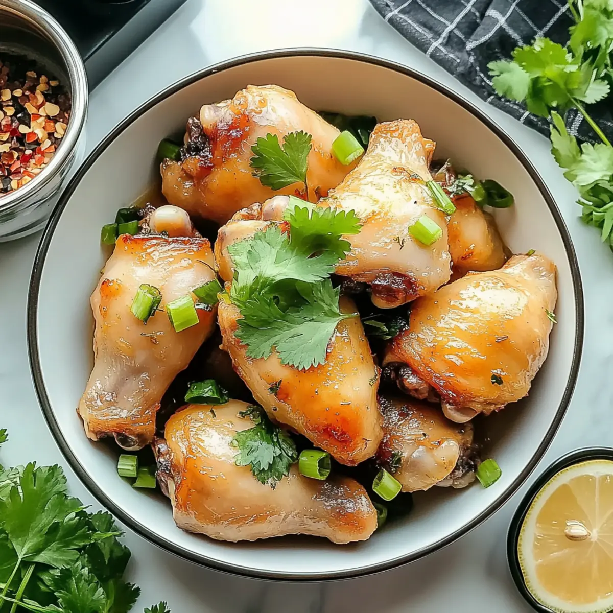 In a large mixing bowl, combine your finely chopped lemongrass, minced garlic, and shallot with fish sauce, soy sauce, honey, sesame oil, black pepper, and red pepper flakes. Whisk everything together until the honey dissolves and the marinade is well-blended. This mixture will infuse your chicken with vibrant flavors, creating an irresistible dish.
